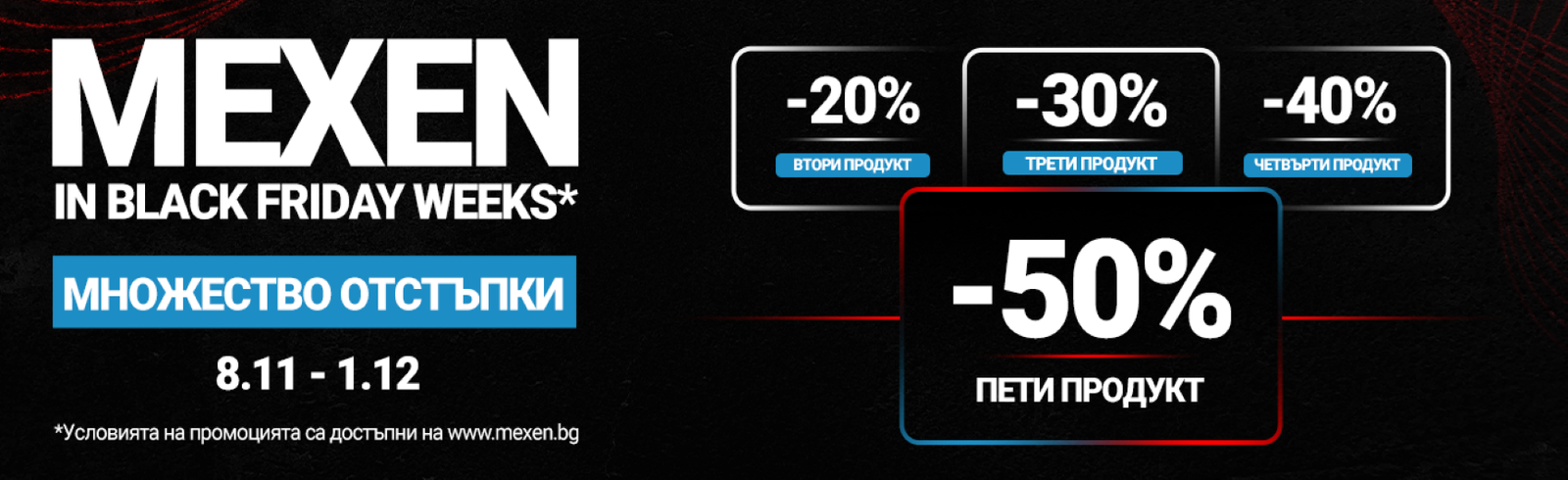Вземете до 50% отстъпка за най-евтиния продукт. Промоцията е валидна до 01.12.2025 г. или до изчерпване на наличностите.