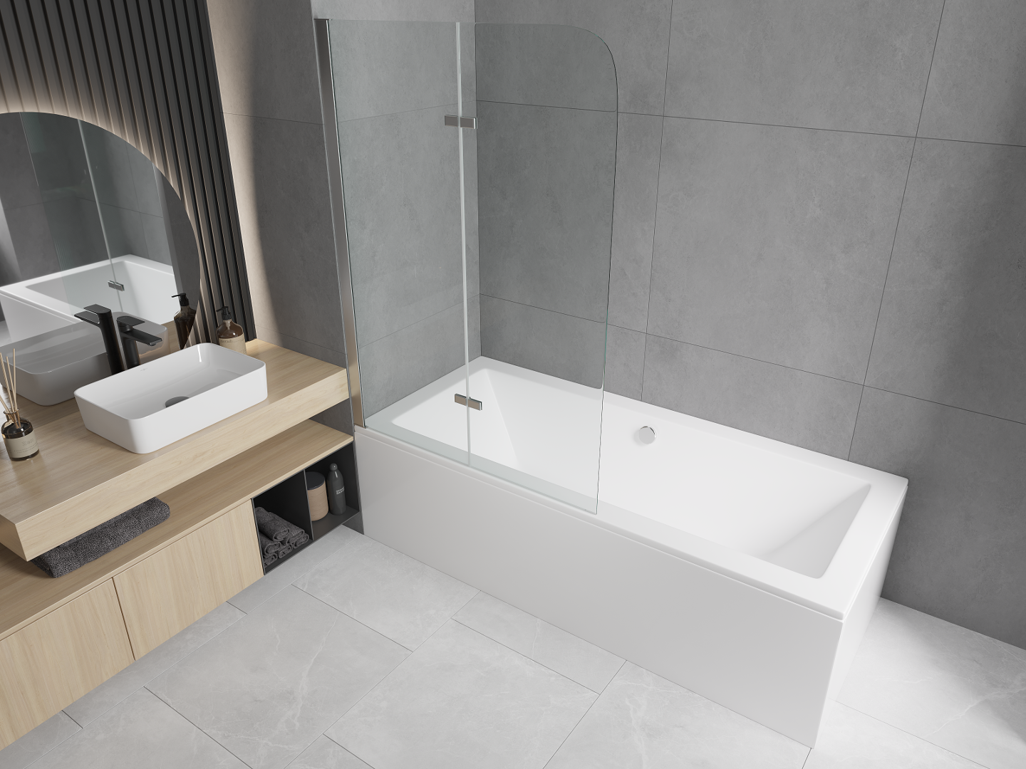 Екран, изработен от две крила с възможност за сгъване. Такова решение позволява да се спести повече пространство в банята и позволява свободното използване на останалото пространство, когато не използваме зоната за къпане.