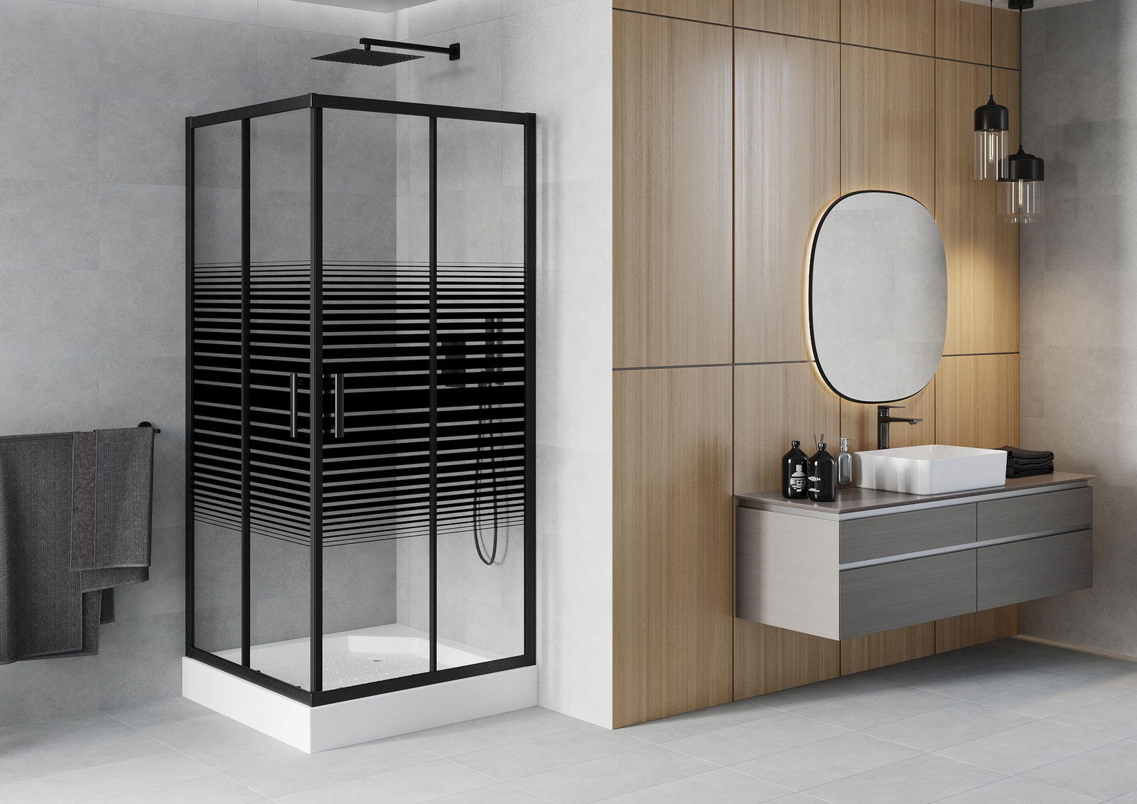 Mexen Rio Квадратна душ кабина 90 x 90 см, черни ленти, черна + поддушово корито, бяло - 860-090-090-70-20-4510