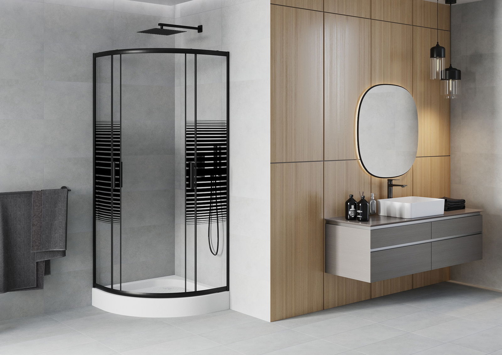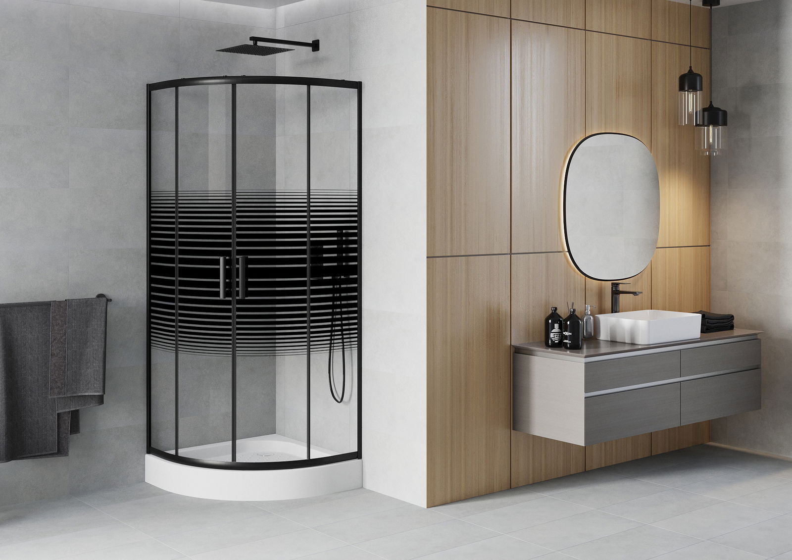 Mexen Rio полукръгла душ кабина 80 x 80 см, черни ивици, черна + душ подложка, бяла - 863-080-080-70-20-4710