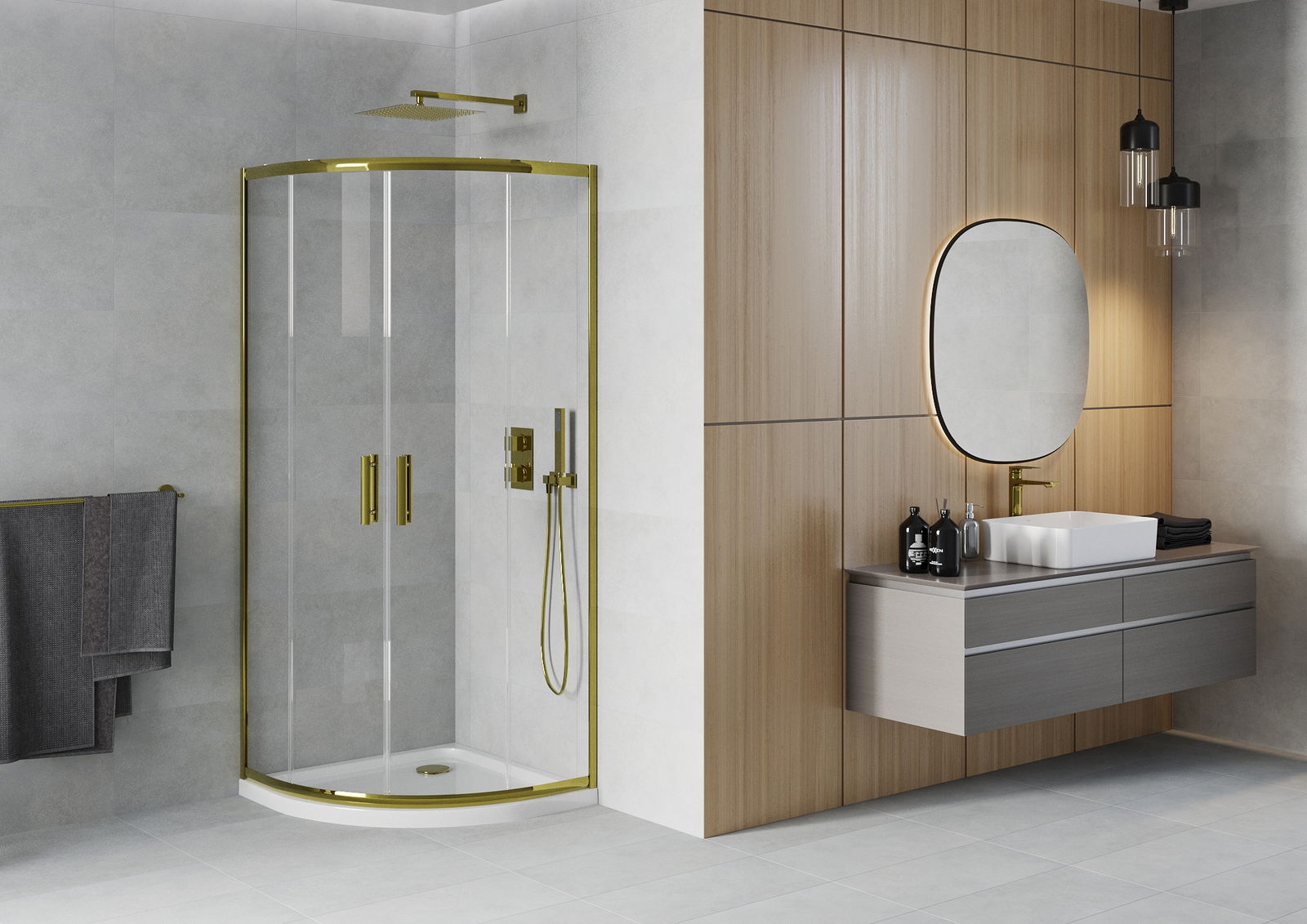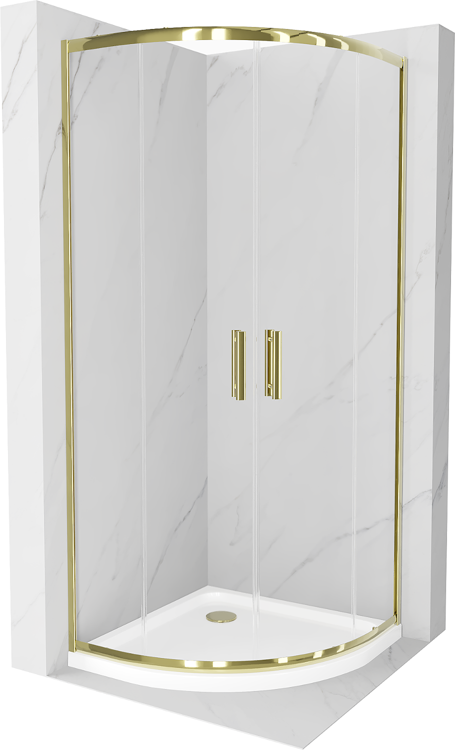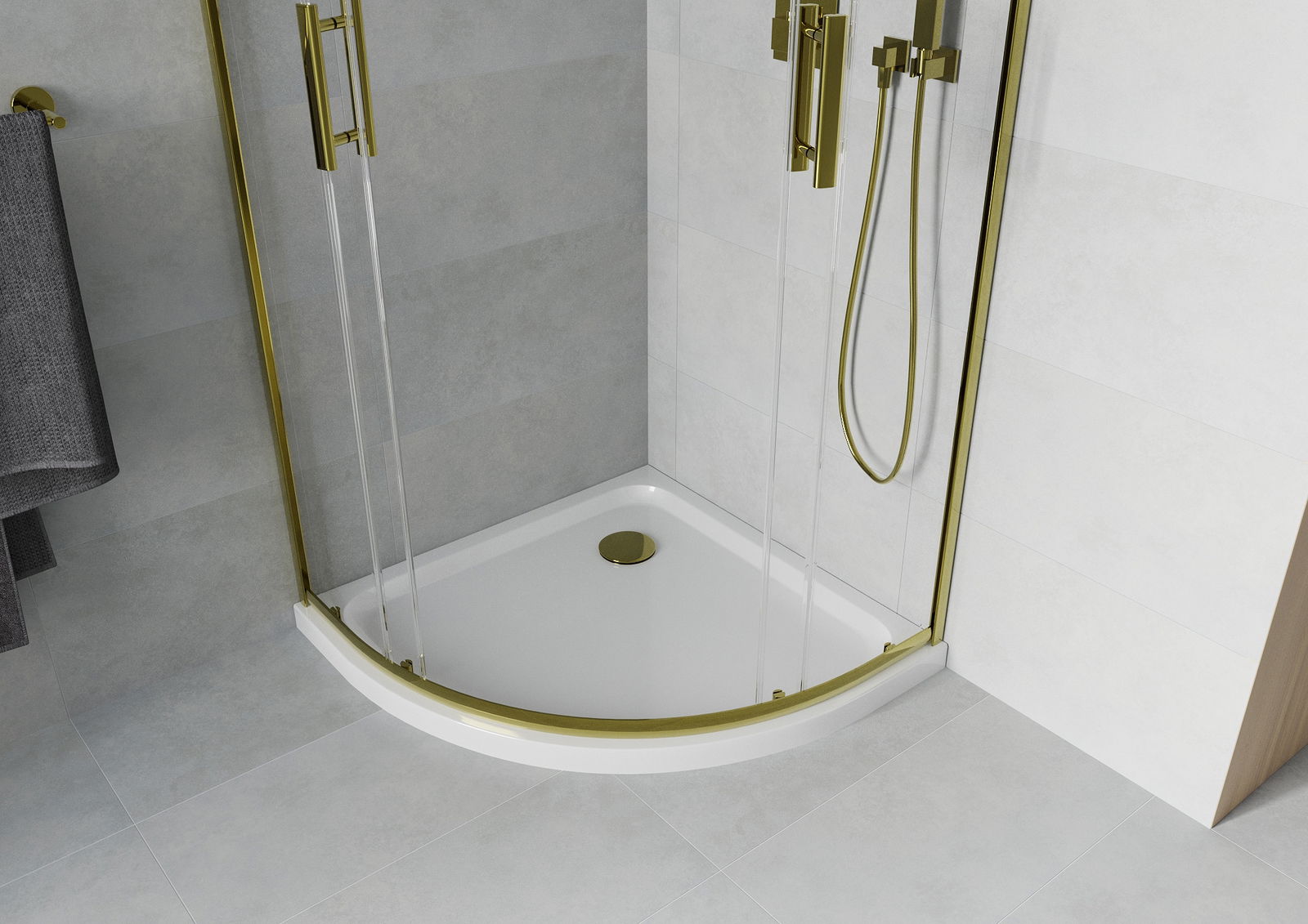Mexen Rio полукръгла душ кабина 90 x 90 см, прозрачна, златна + плосък поддушник, бял - 863-090-090-50-00-4110G