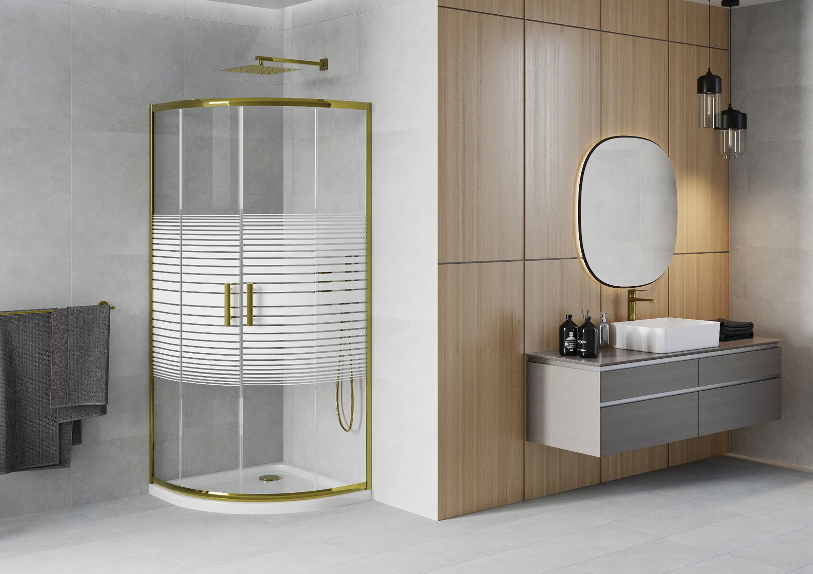 Mexen Rio душ кабина полукръгла 80 x 80 см, бели ленти, златна + плосък поддушов корито, бяло - 863-080-080-50-20-4110G