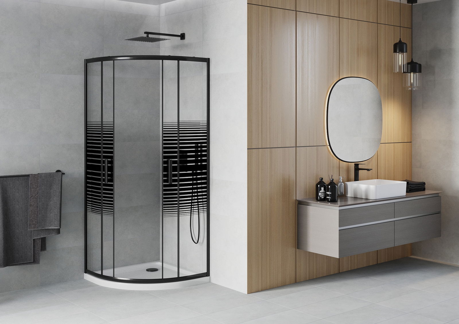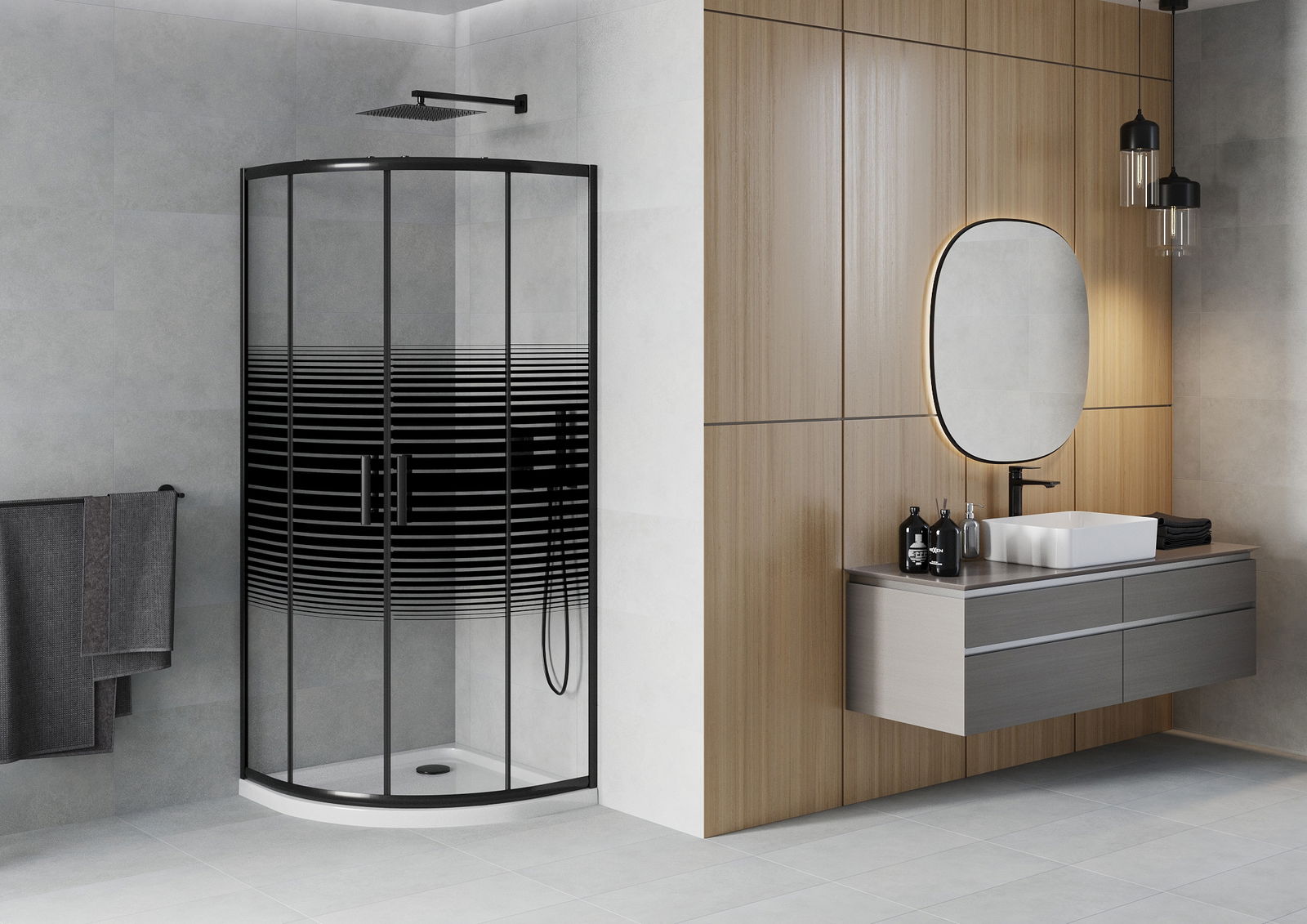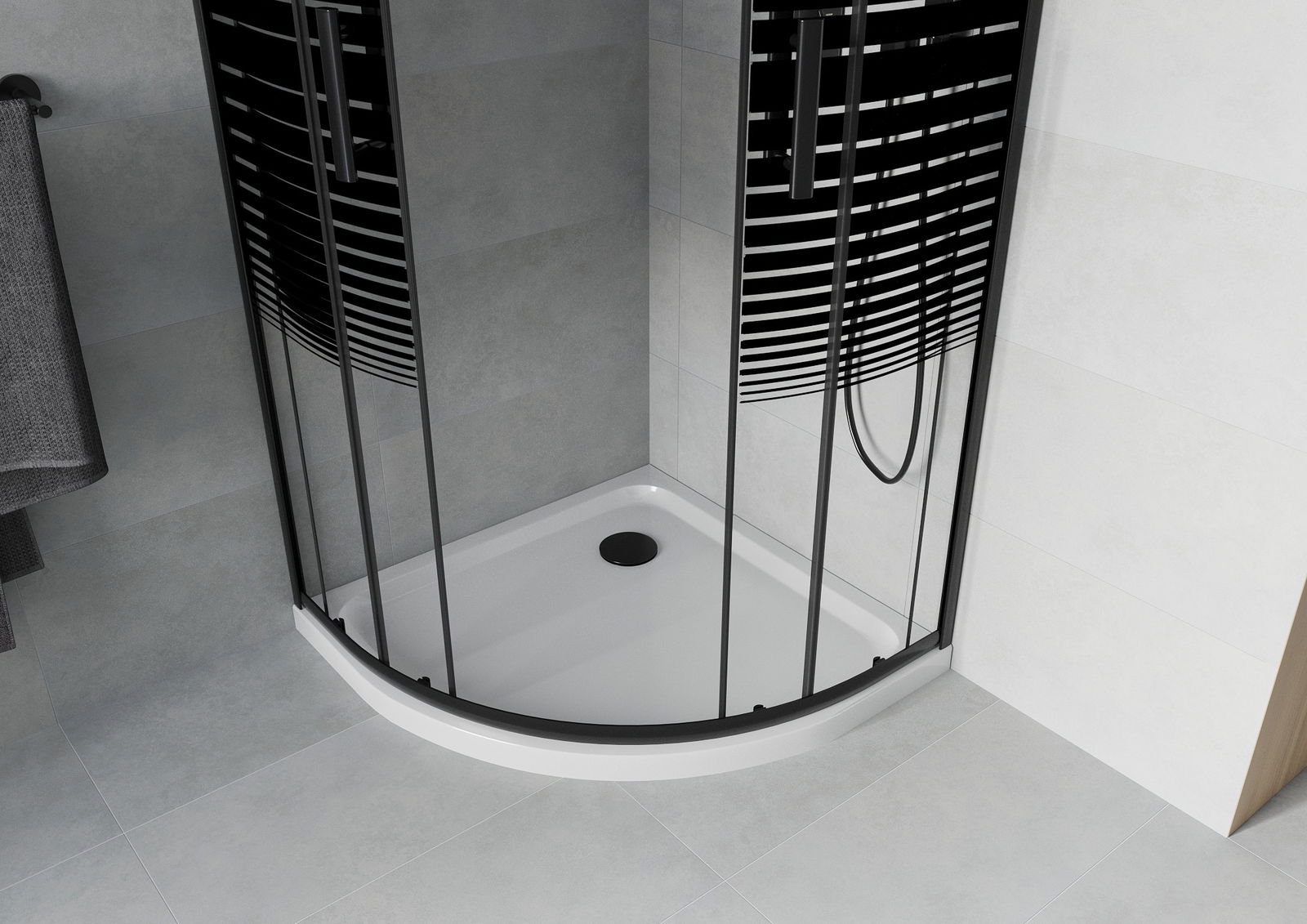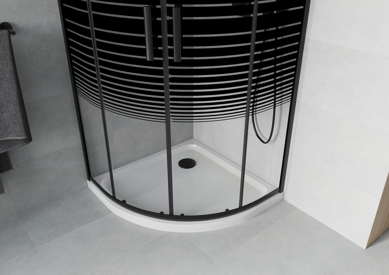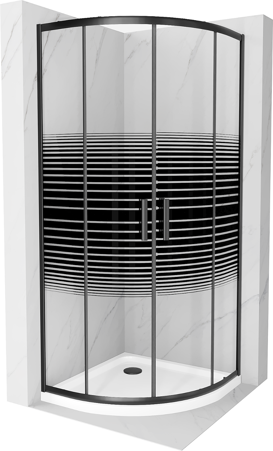 Mexen Rio полукръгла душ кабина 90 x 90 см, черни ивици, черна + плосък поддушов съд, бял - 863-090-090-70-20-4110B