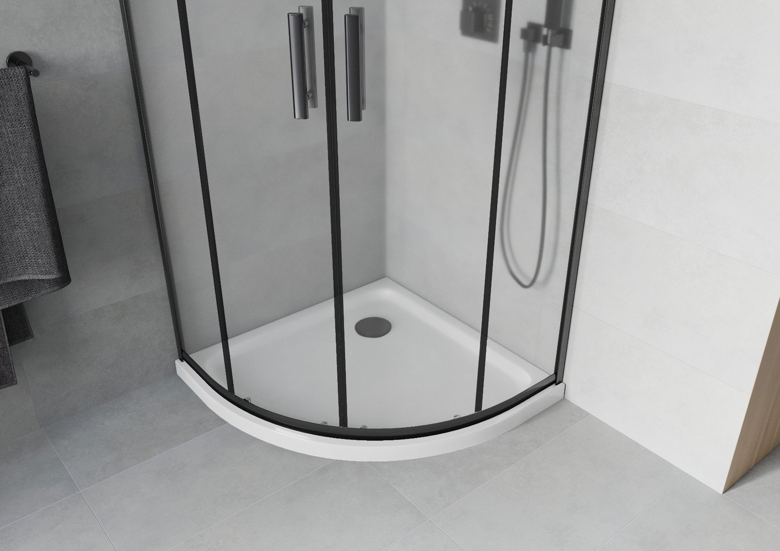 Удобната и практична дръжка е изработена от здрав и устойчив метал. Модерната форма в съчетание с покритието, съответстващо на цвета на профилите, придава на цялото модерен и стилен вид, подчертавайки естетиката на всяка баня.