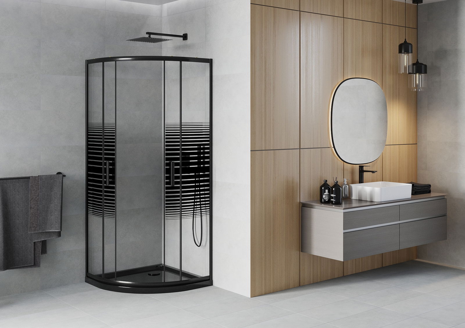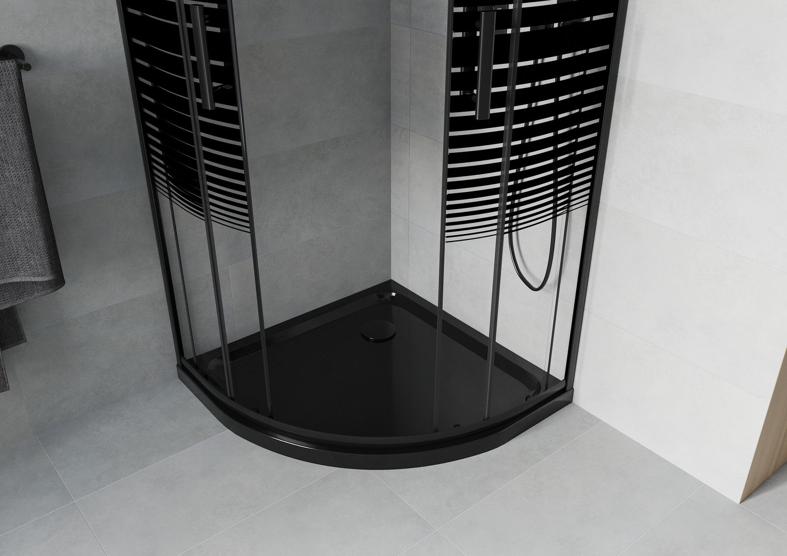 Mexen Rio полукръгла душ кабина 90 x 90 см, черни ивици, черна + корито Flat, черно - 863-090-090-70-20-4170B