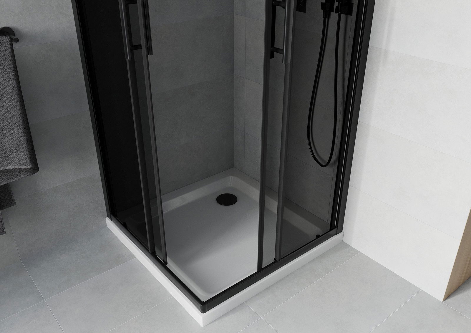 Удобната и практична дръжка е изработена от здрав и устойчив метал. Модерната форма в съчетание с покритието, съответстващо на цвета на профилите, придава на цялото модерен и стилен вид, подчертавайки естетиката на всяка баня.