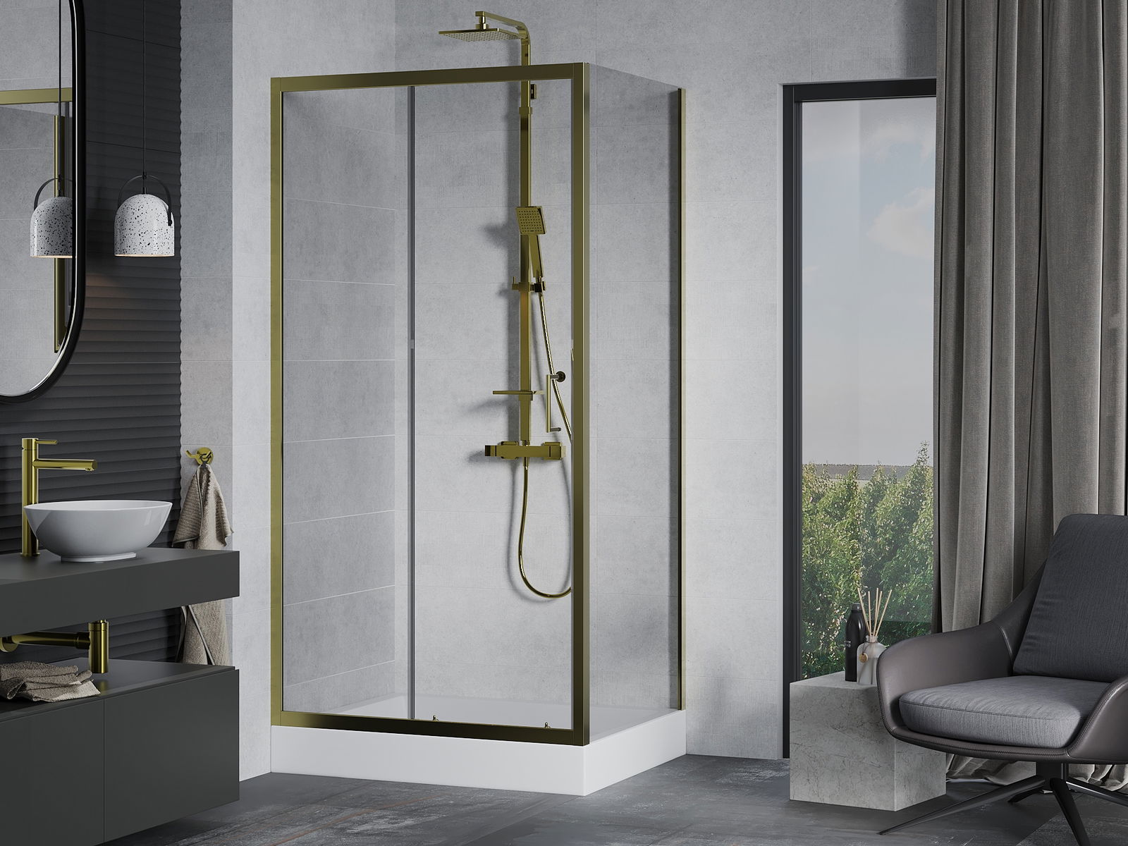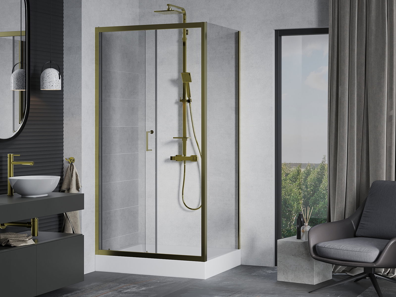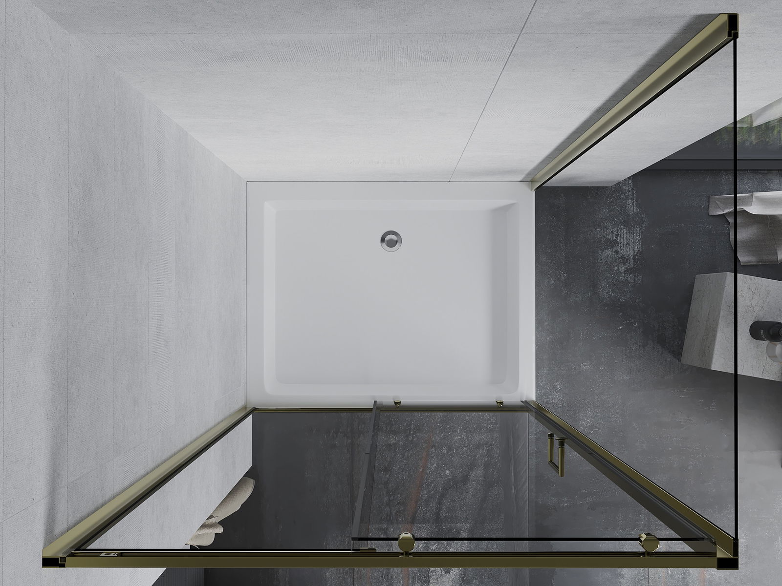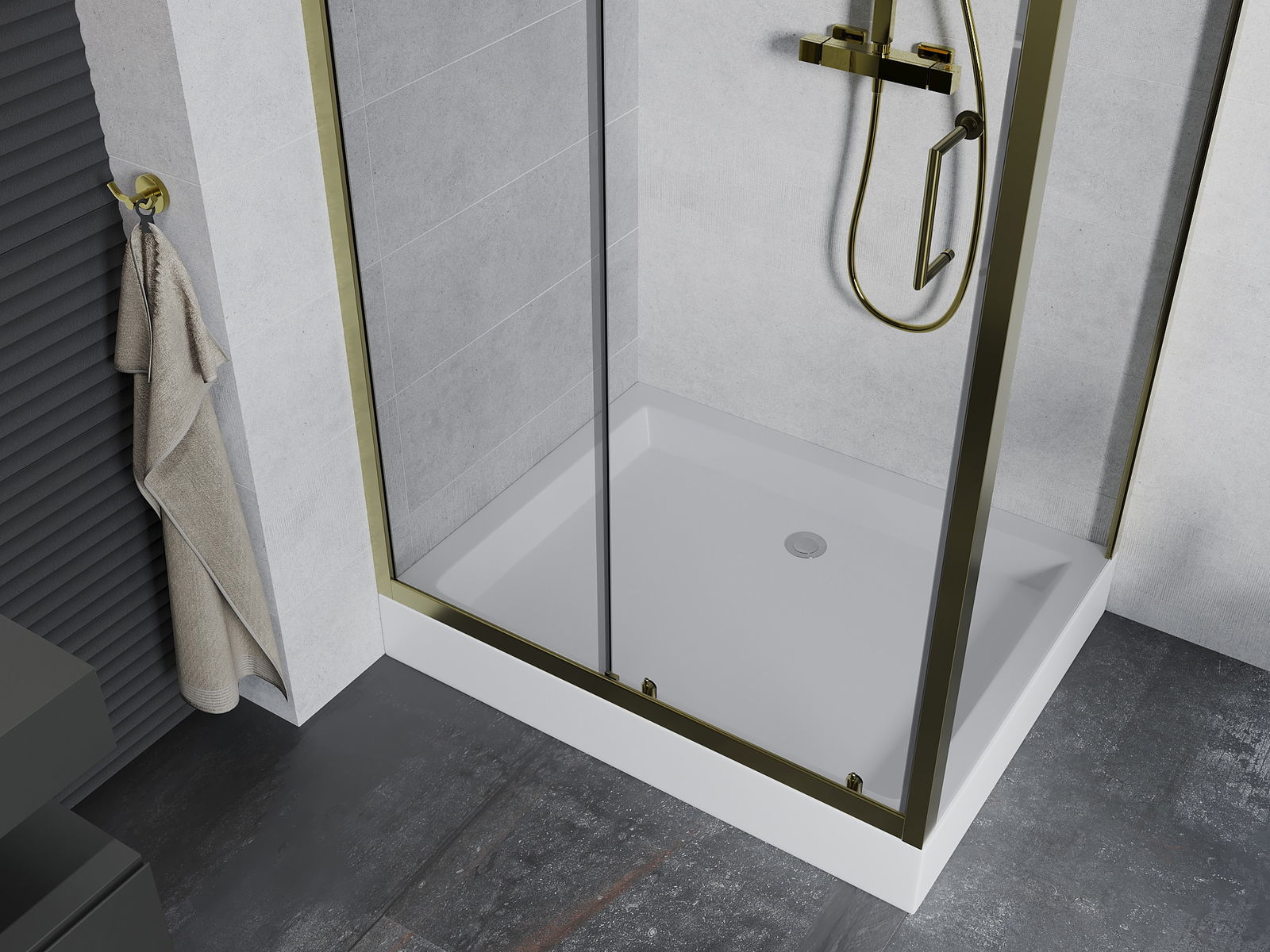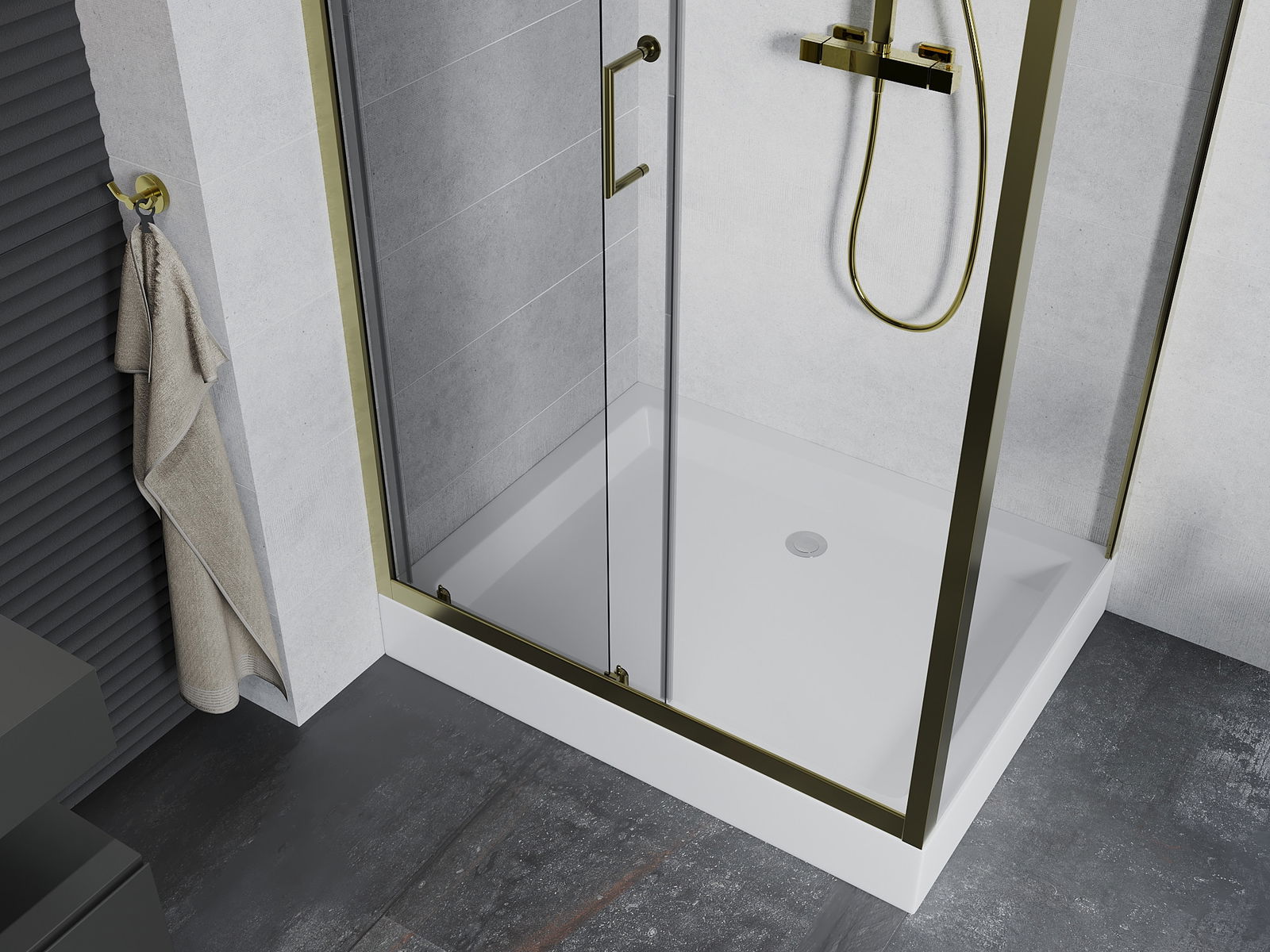 Удобната и практична дръжка е изработена от здрав и устойчив метал. Модерната форма в съчетание с покритието, съответстващо на цвета на профилите, придава на цялото модерен и стилен вид, подчертавайки естетиката на всяка баня.