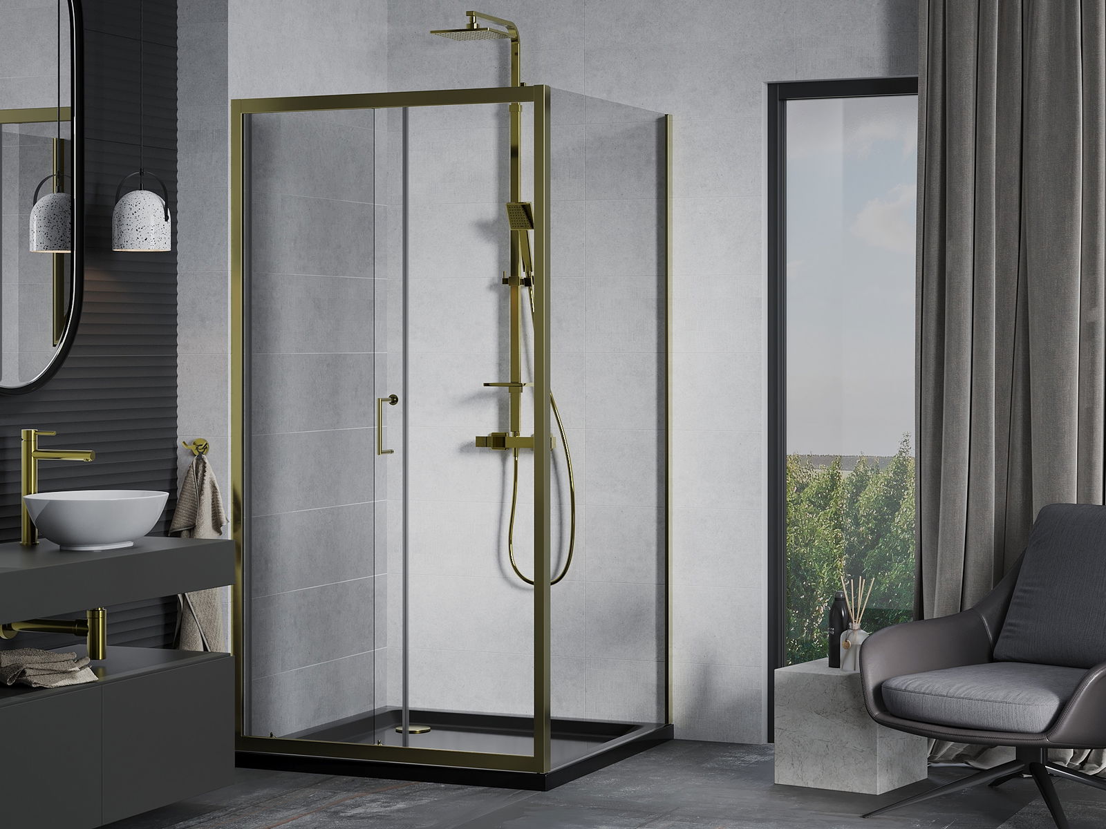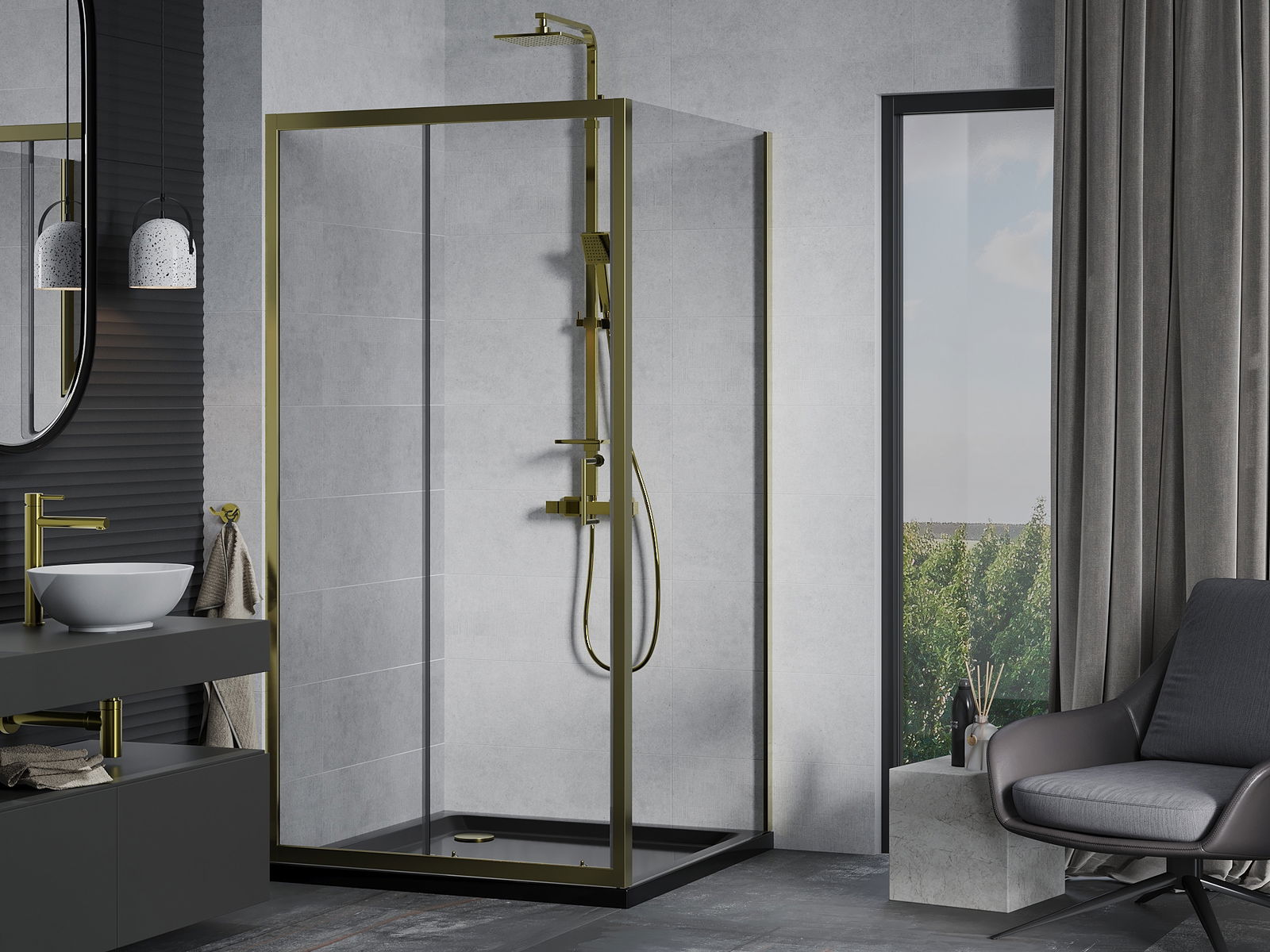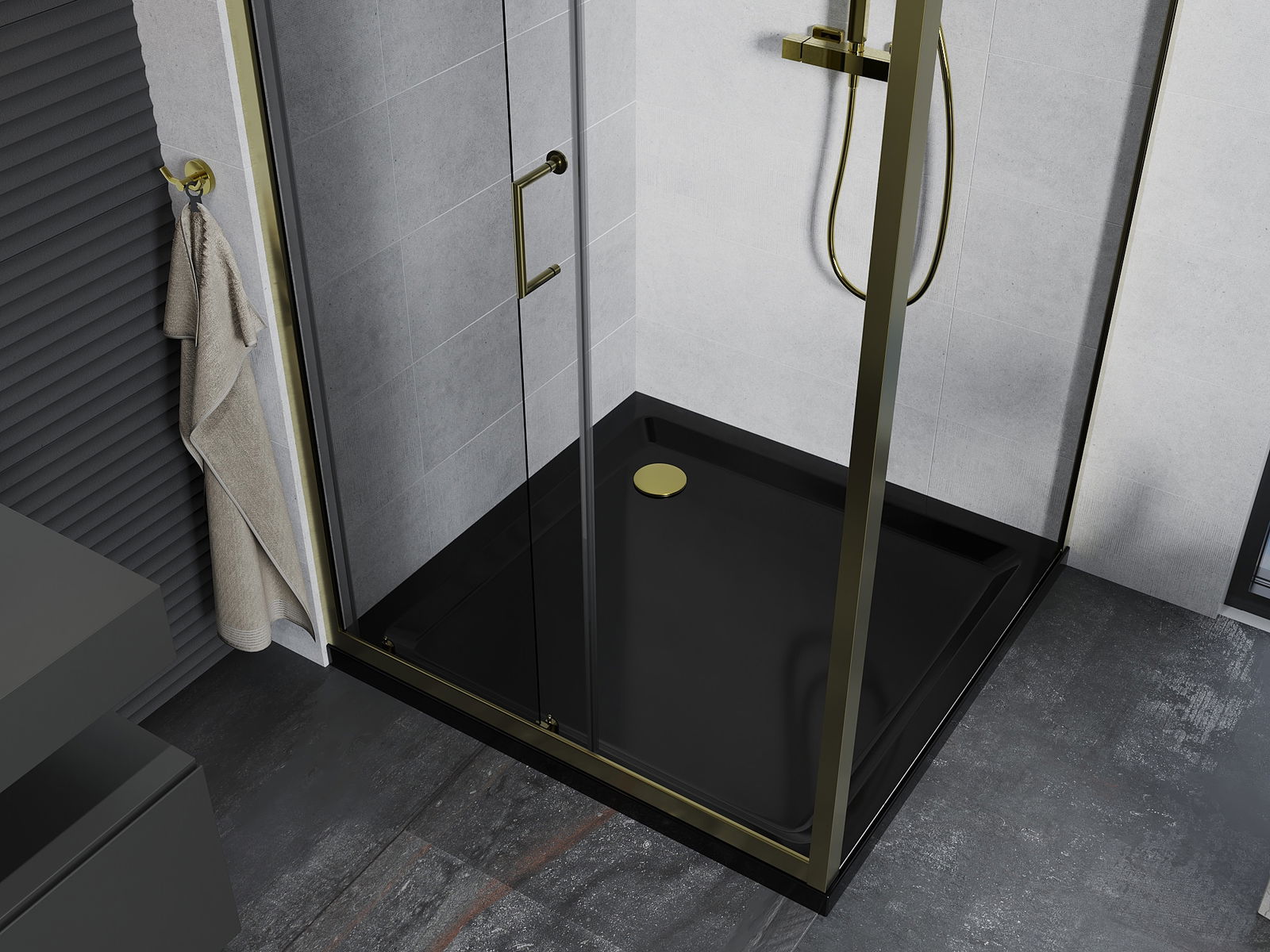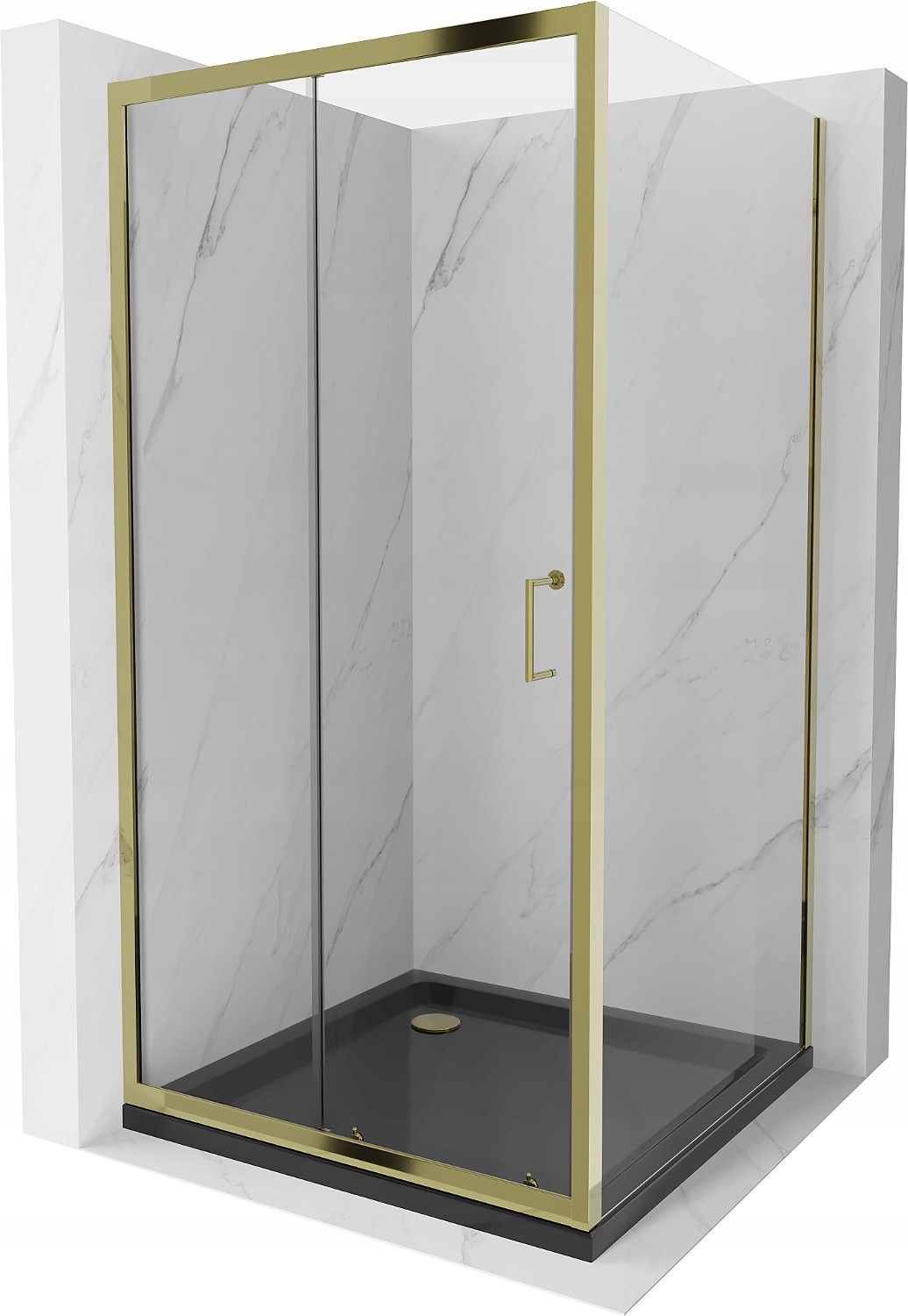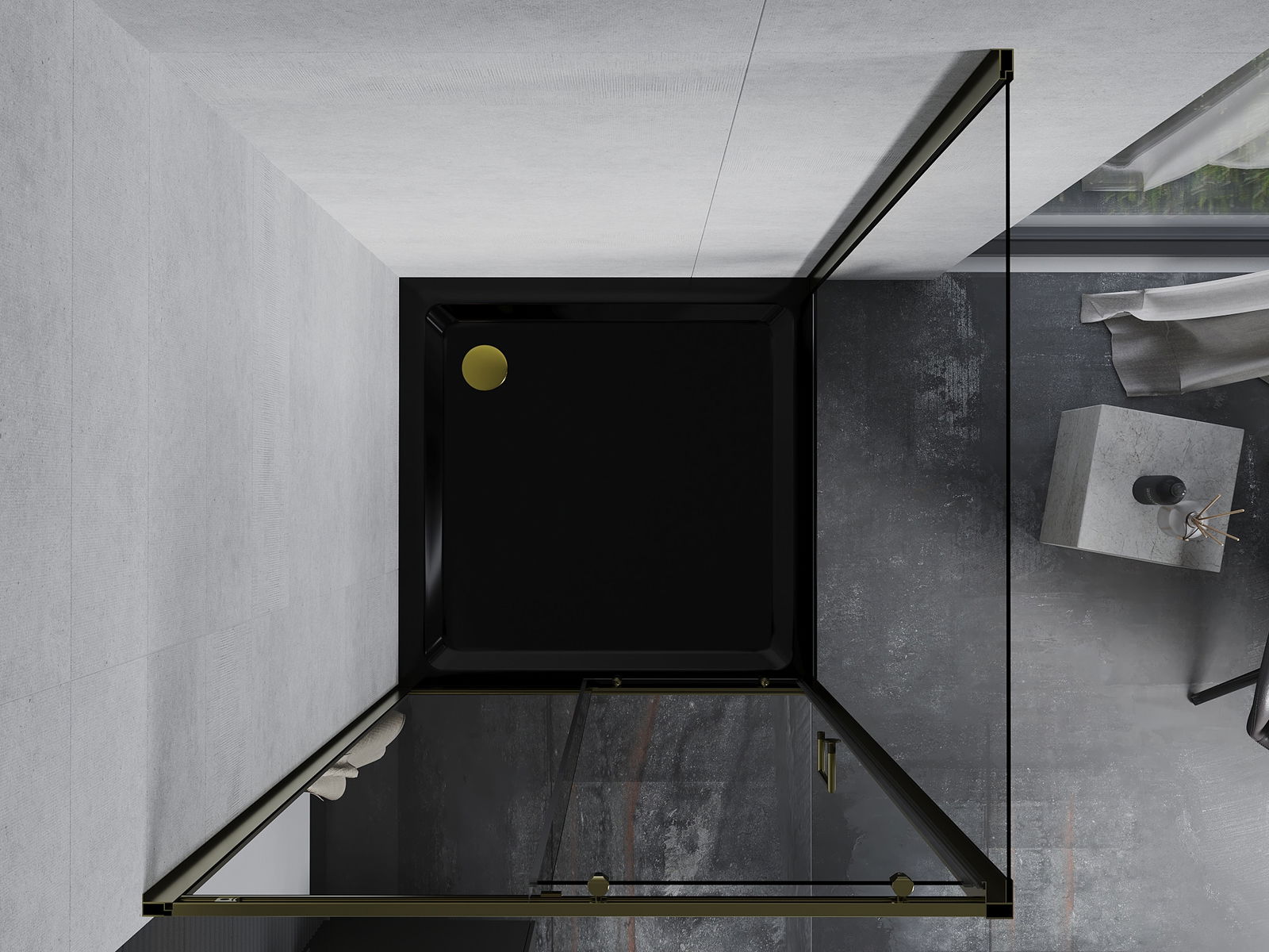 Mexen Apia плъзгаща душ кабина 90 x 90 см, прозрачна, златна + плосък поддушов съд, черен - 840-090-090-50-00-4070G