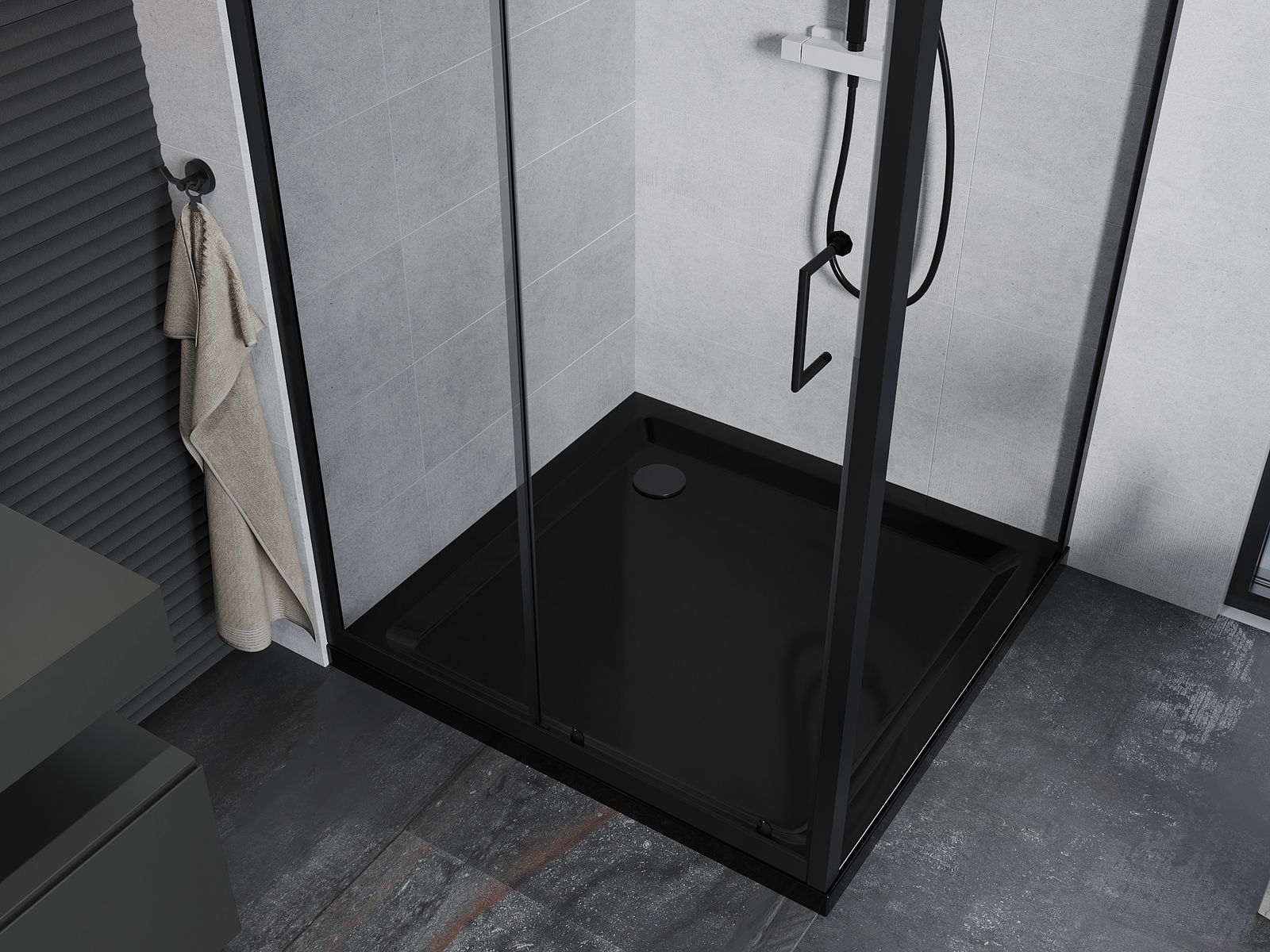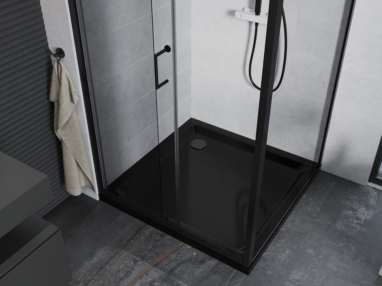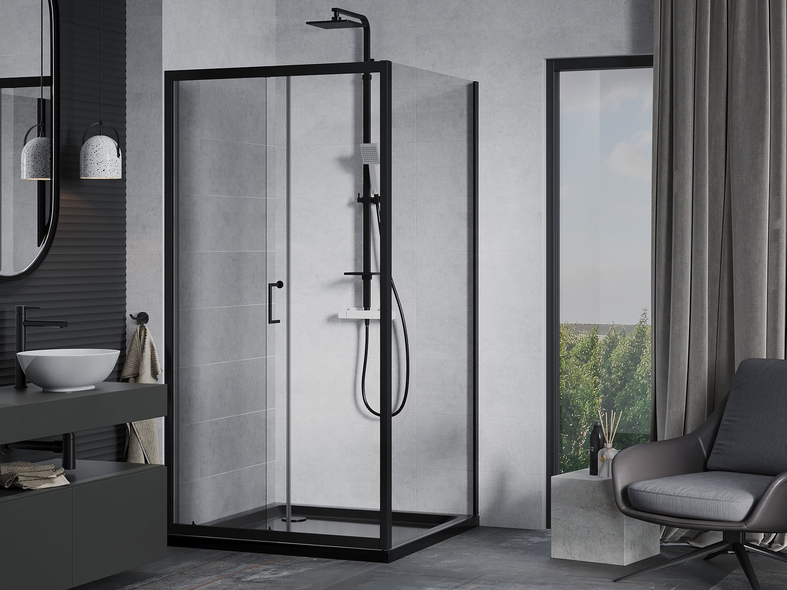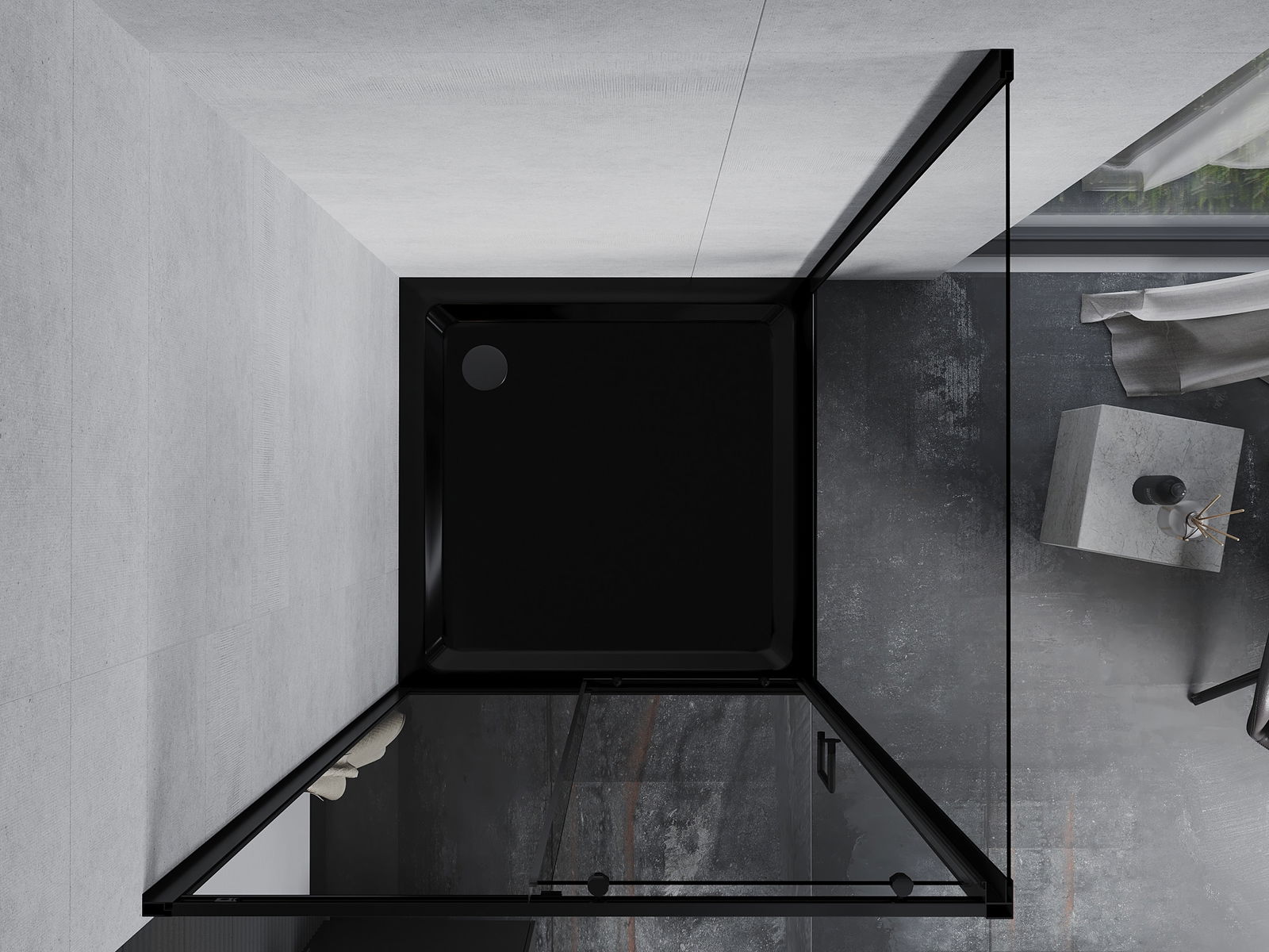 Mexen Apia плъзгаща се душ кабина 90 x 90 см, прозрачна, черна + плосък поддушов съд, черен - 840-090-090-70-00-4070B