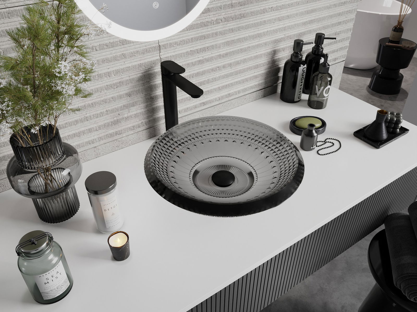 Мивката се отличава с уникална структура от кристали, придавайки му уникален и изключително ефективен вид. Кристалите блестят на светлината, хващайки окото и добавяйки елегантност. Практическо и стилно решение за всяка баня.