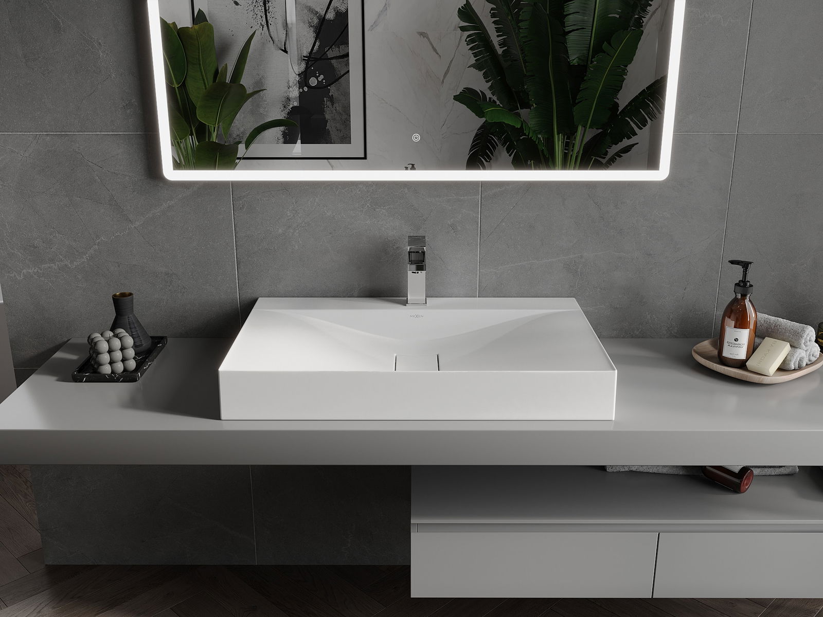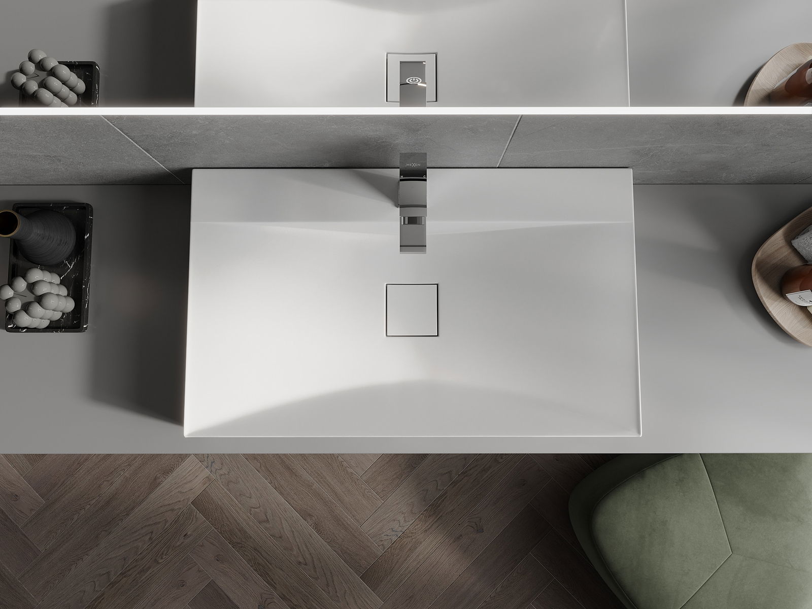 Мивката има дупка, в която можем да монтираме батерията. Това спестява ценно пространство в банята и подчертава естетиката му. Това решение също ви позволява лесно да се държите чисти около мивката.