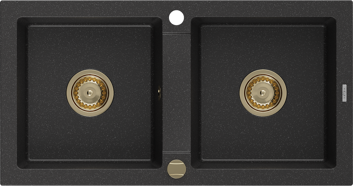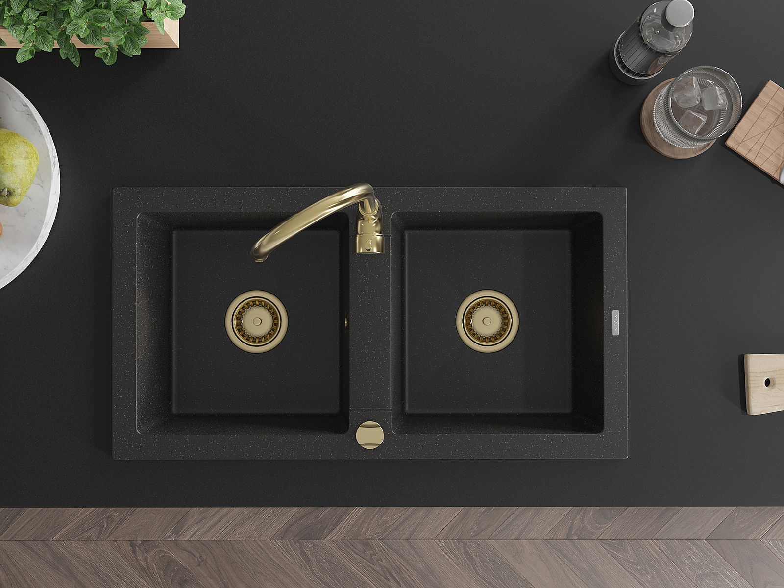 Mexen Mario гранитна мивка с 2 камери 820 x 436 мм, черен/сребърен металик, златен сифон - 6504822000-73-G