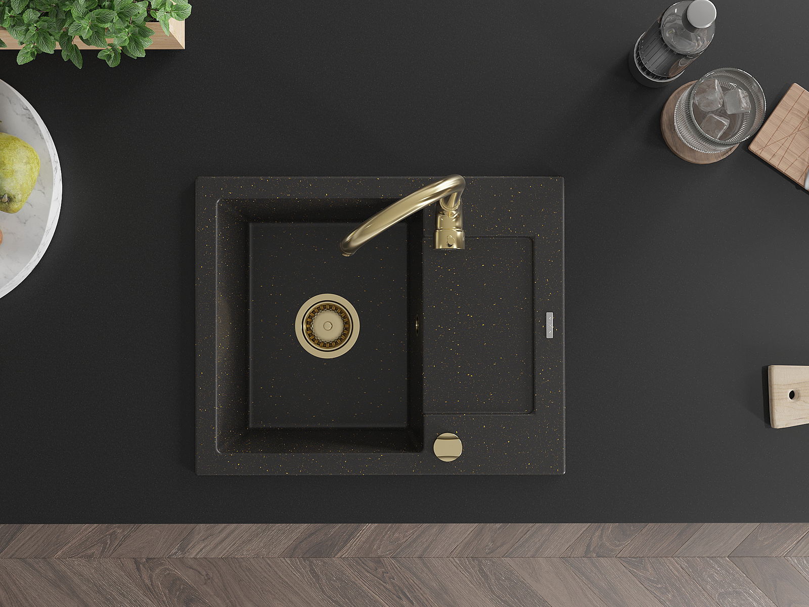 Mexen Enzo гранитна кухненска мивка с 1 корито и отцедник 576 x 465 мм, черно/златен металик, златен сифон - 6506571005-75-G