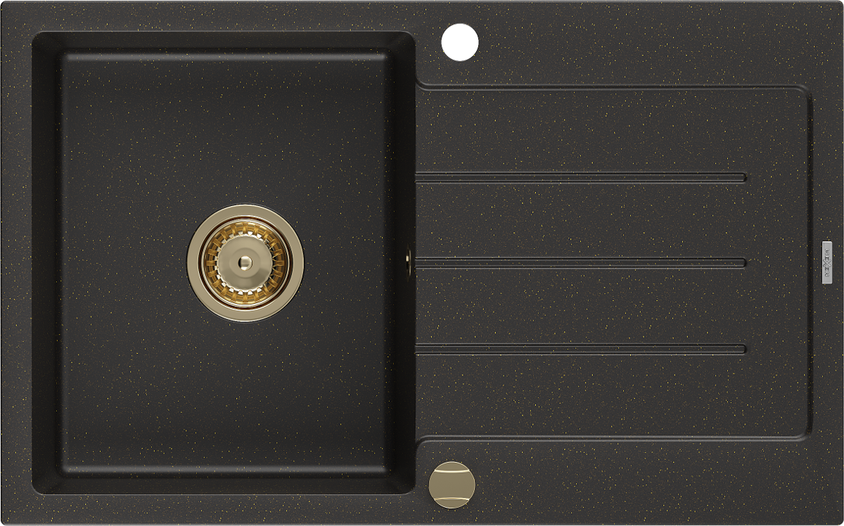 Mexen Bruno мивка от гранит 1-камерна с отцедник 795 x 495 mm, черен/златист металик, сифон златист - 6513791010-75-G