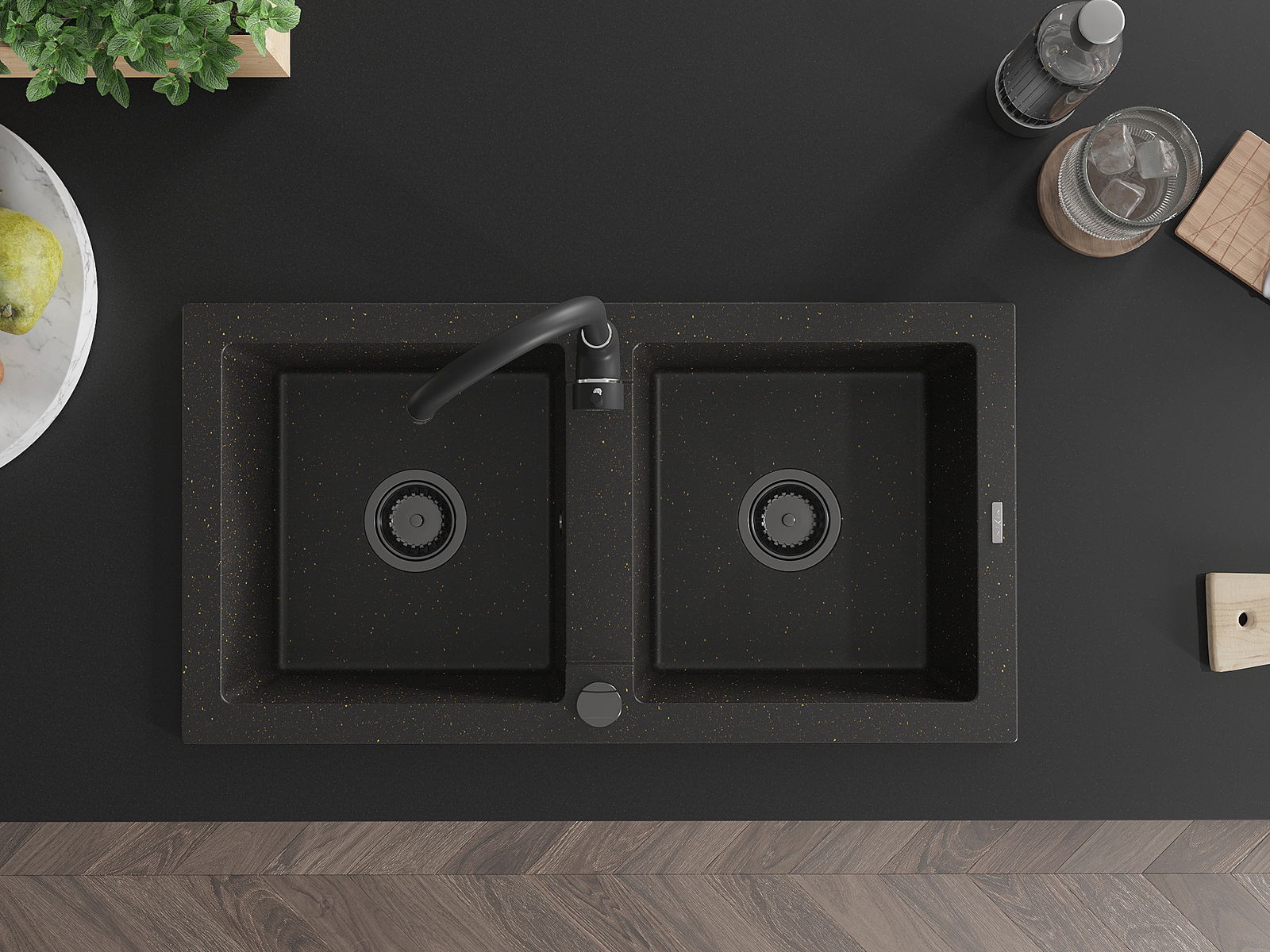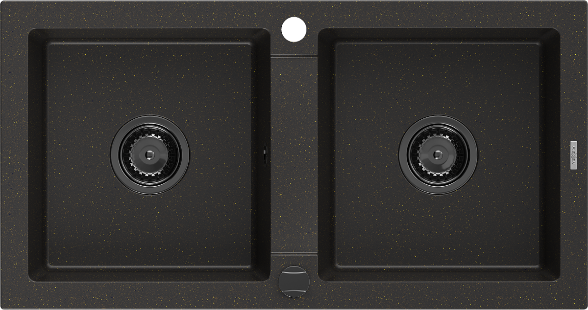Mexen Mario гранитна мивка с 2 камери 820 x 436 мм, черен/златен металик, черен сифон - 6504822000-75-B