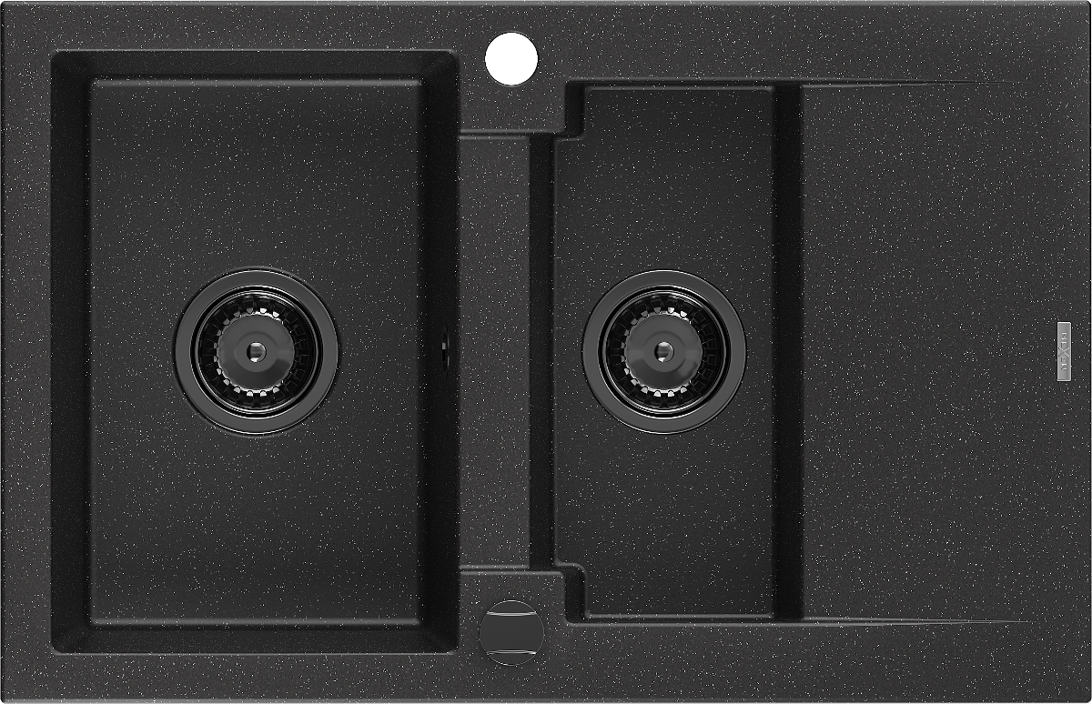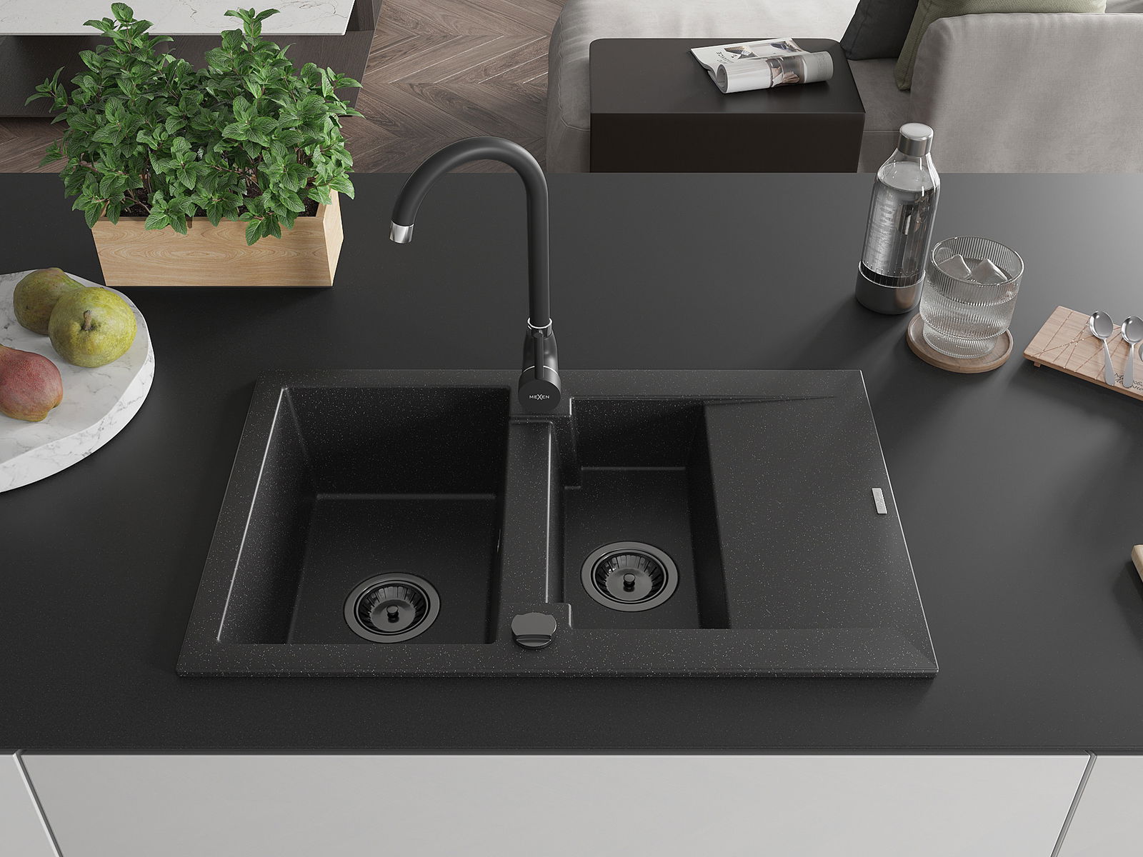 Mexen Gaspar мивка от гранит с 1,5 камери и отцедник 737 x 475 мм черно/сребрист металик, черен сифон - 6507731505-73-B