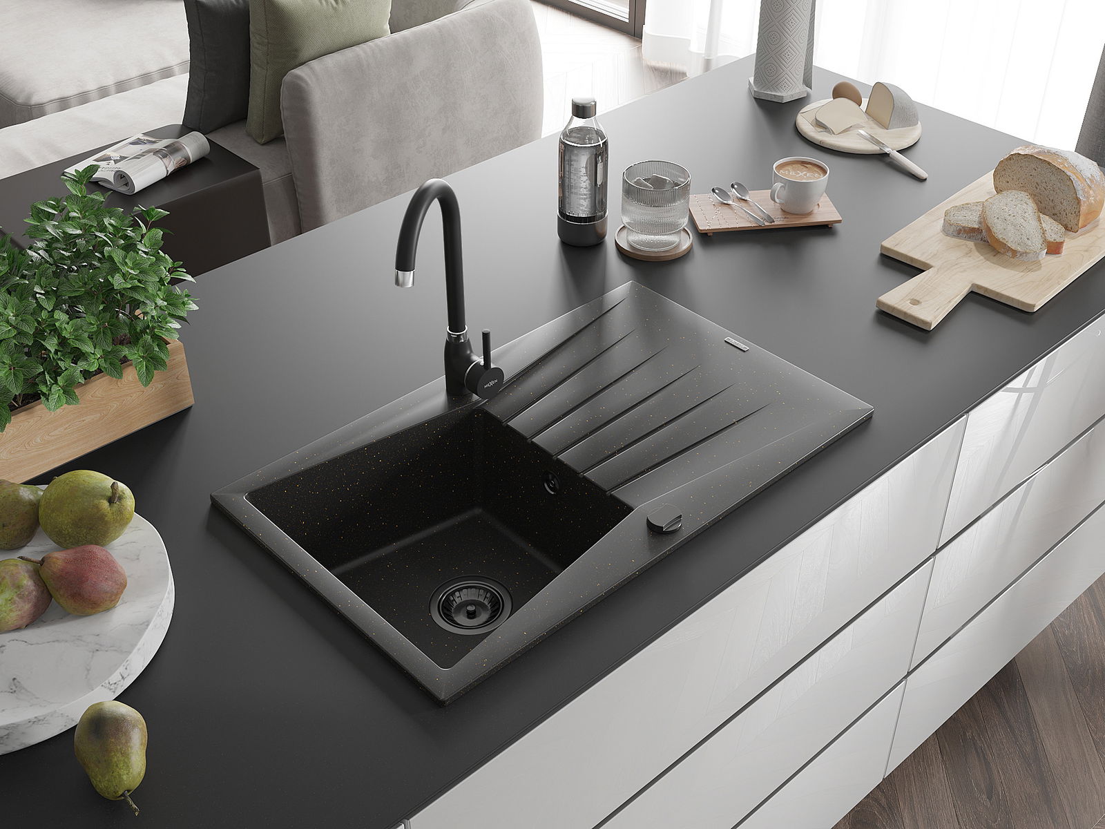 Мекзен Цезар гранитна мивка 1-камерна с изцедник 775 x 470 мм, черна/златен металик, черен сифон - 6514771010-75-B