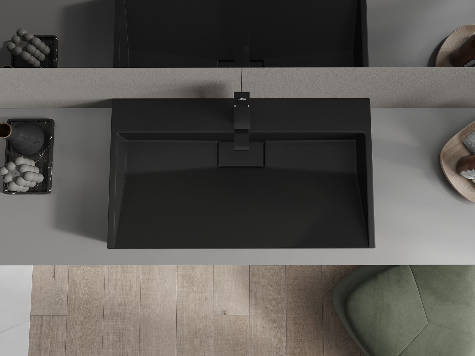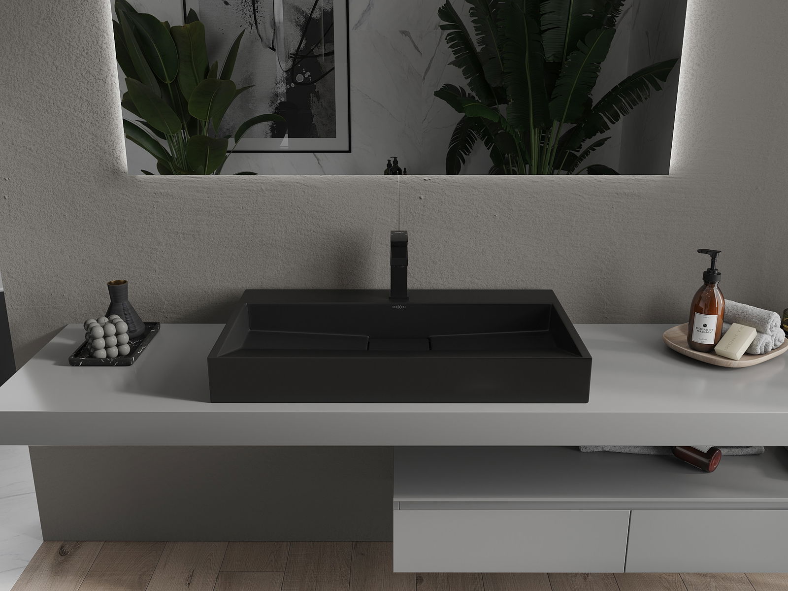 Конгломератната мивка за монтаж върху плота е елегантно решение, което добавя модерен характер на всяка баня. С размери 80 x 46 см и височина 11 см, тя се вписва идеално в различни интериори. Черният цвят и лъскавата повърхност й придават стилен вид, а липсата на преливен отвор подчертава минималистичния дизайн. Благодарение на материала от конгломерат, мивката е издръжлива и лесна за поддържане на чистота. Идеална за създаване на изключително пространство в банята.