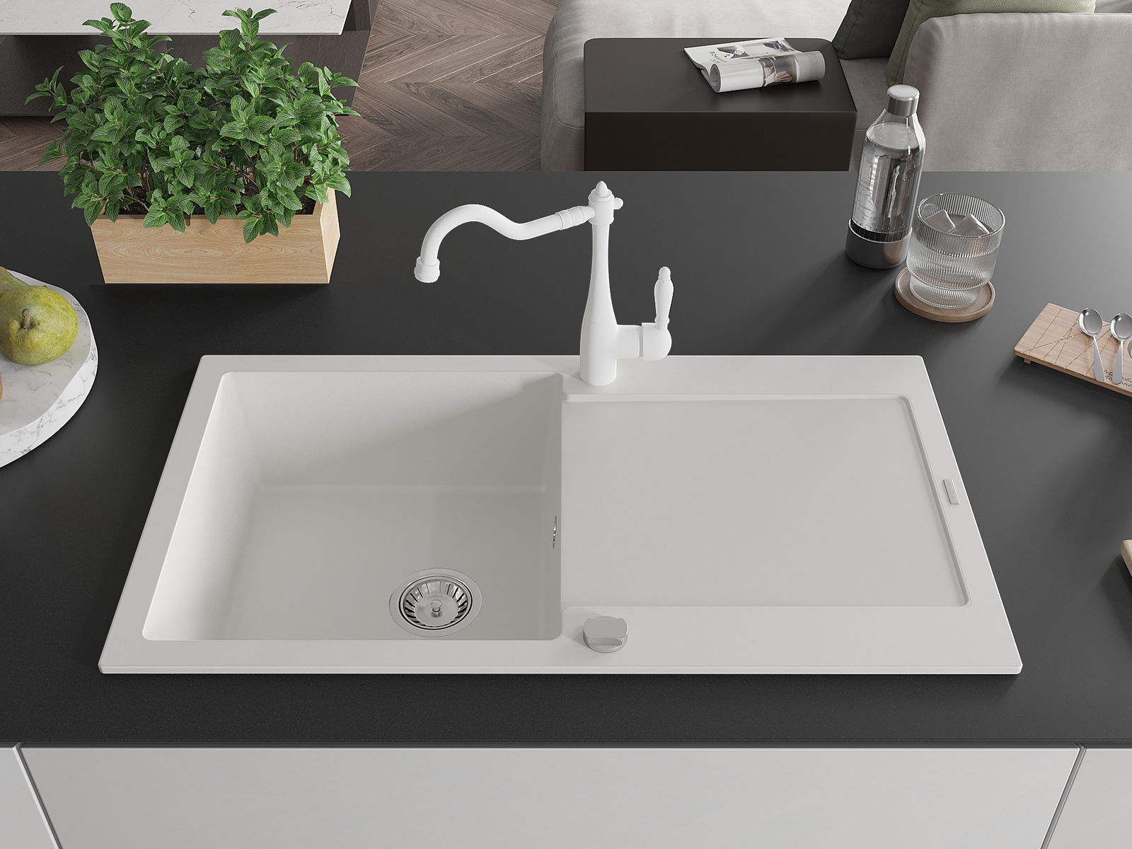 Mexen Leo гранитна мивка с една камера и отцедник и кухненски смесител Carla, бял - 6501-20-670700-20