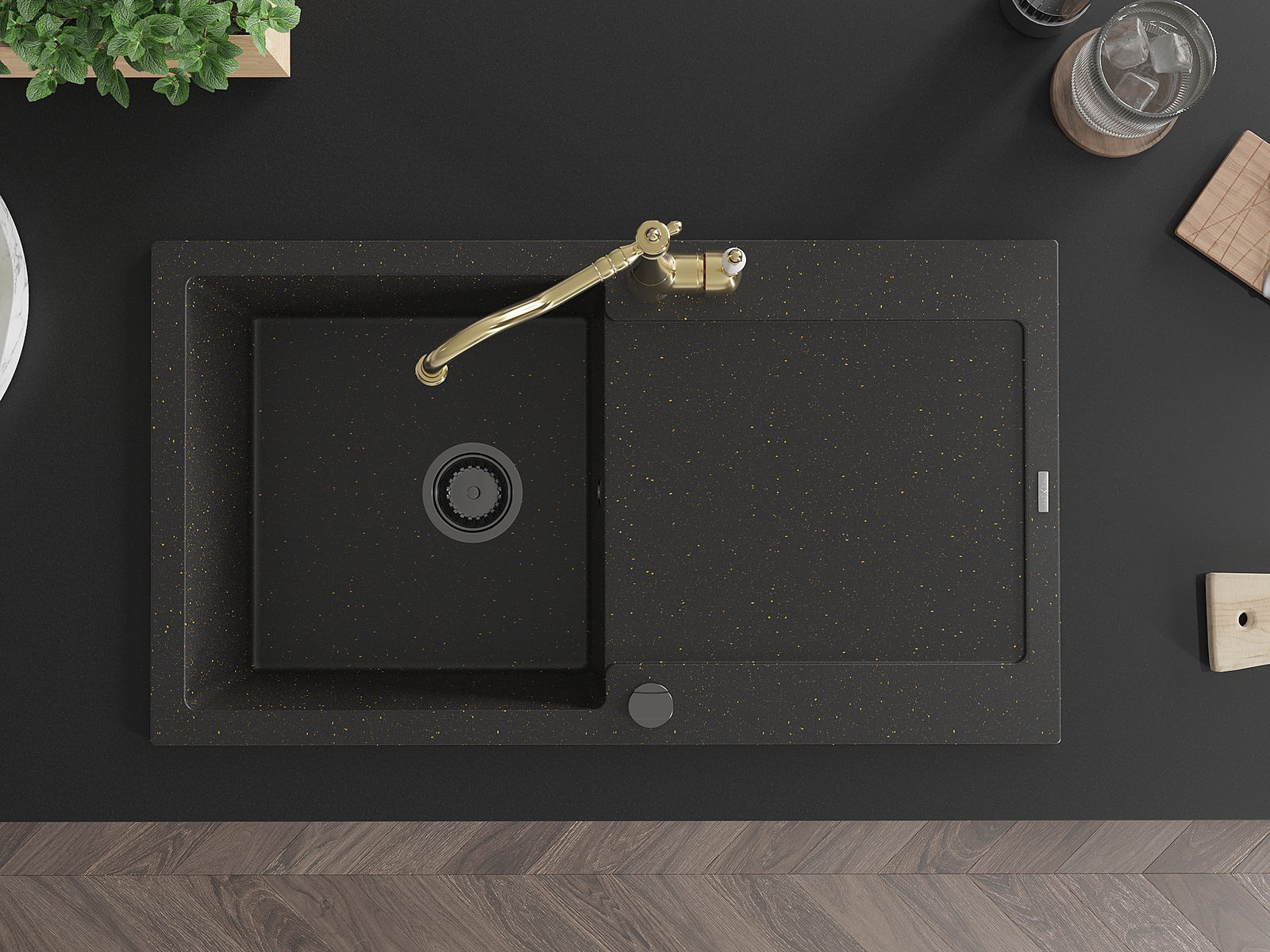 Mexen Leo гранитна мивка с 1 отделение и отцедник и кухненски смесител Carla, черен/златен металик - 6501-75-670700-50-B