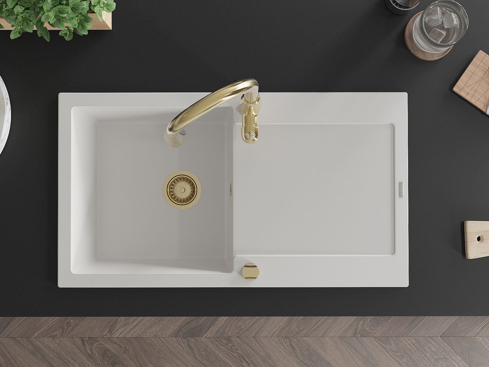 Mexen Leo гранитна мивка 1-камерна с отцедник и кухненски смесител Savita, бял - 6501-20-672601-50