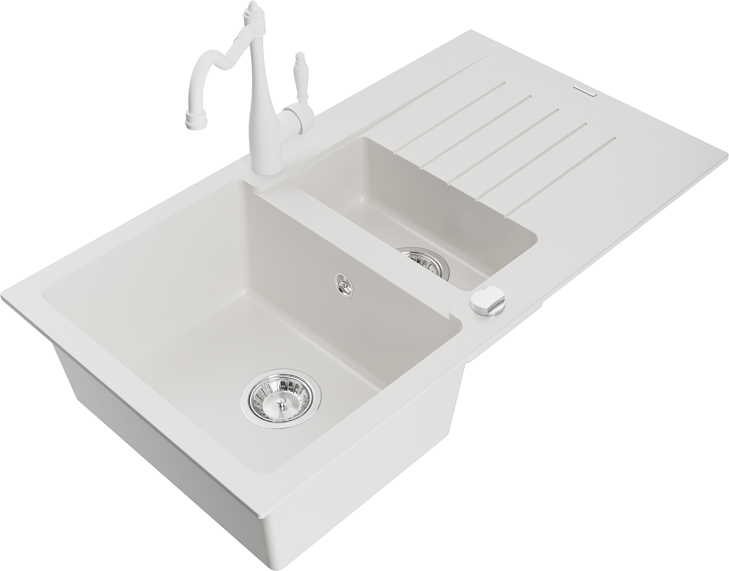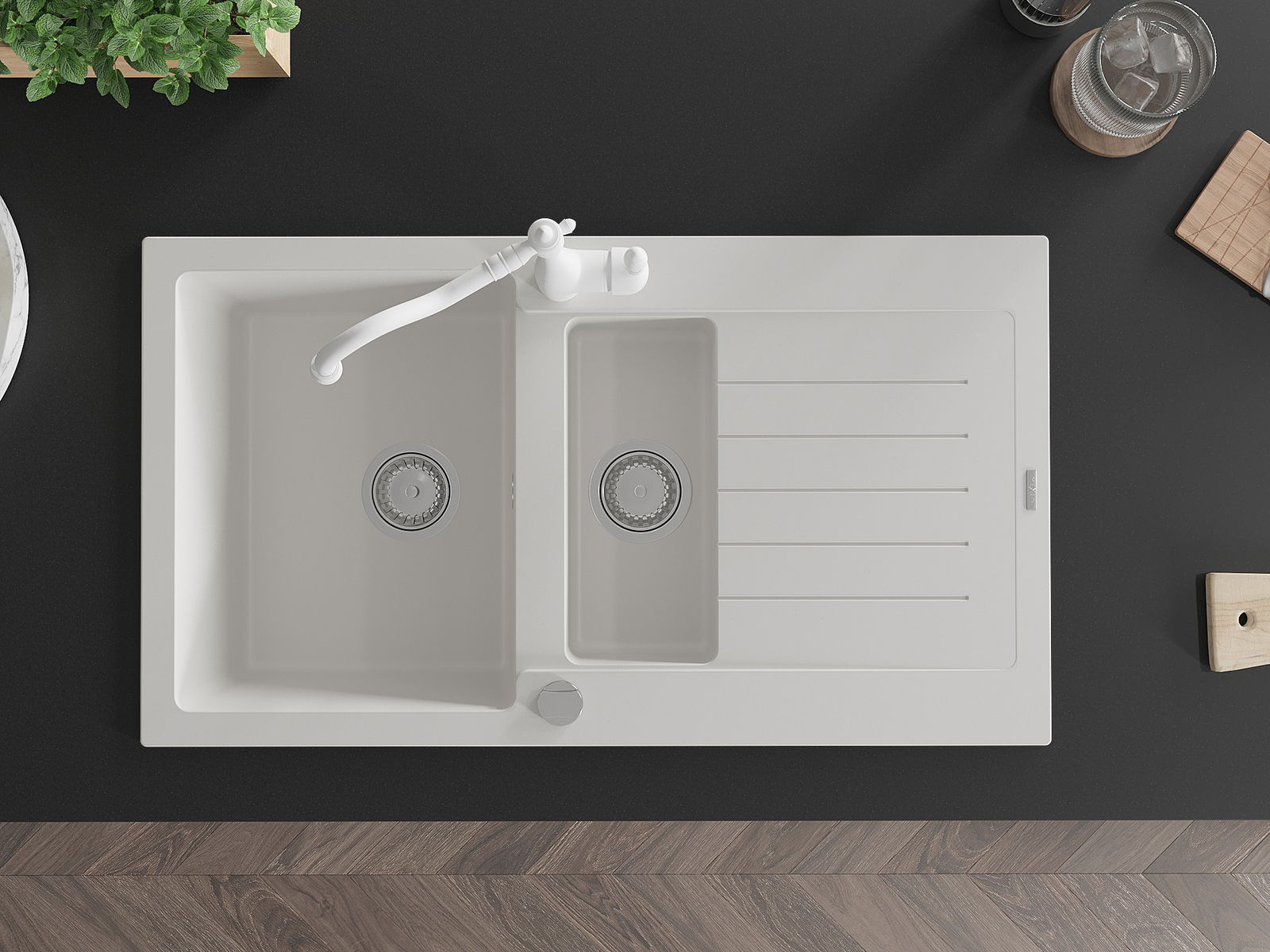 Mexen Matias гранитна мивка 1,5-коморова с отцедник и кухненски смесител Carla, бял - 6502-20-670700-20