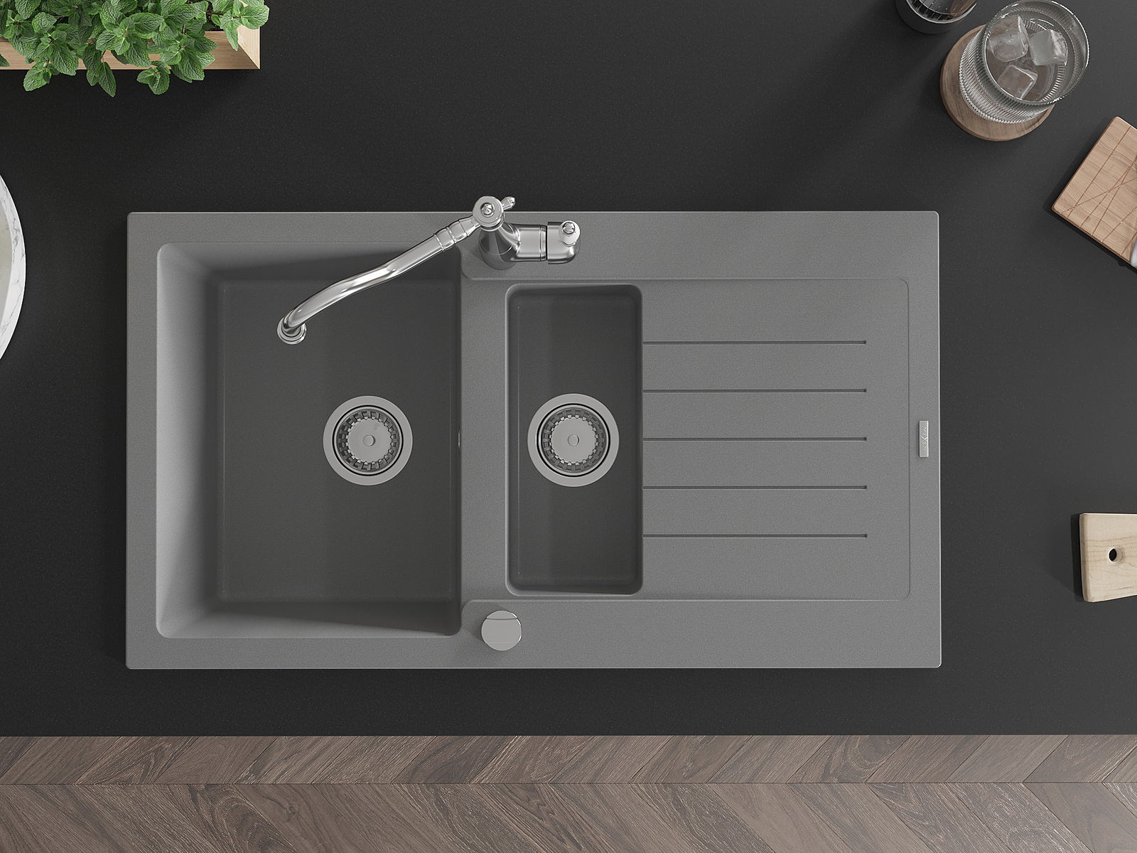 Mexen Matias гранитна кухненска мивка 1,5-коморна с отцедник и кухненски смесител Carla, сив - 6502-71-670700-00