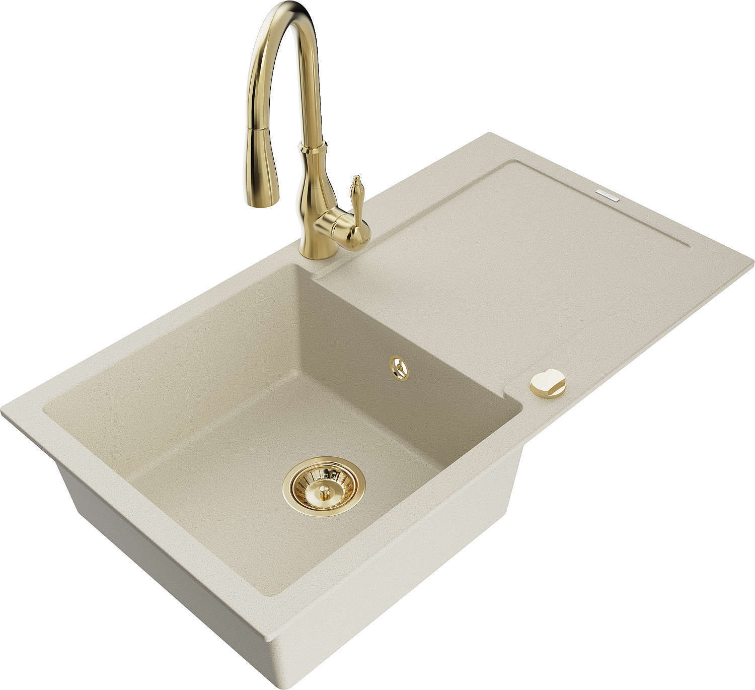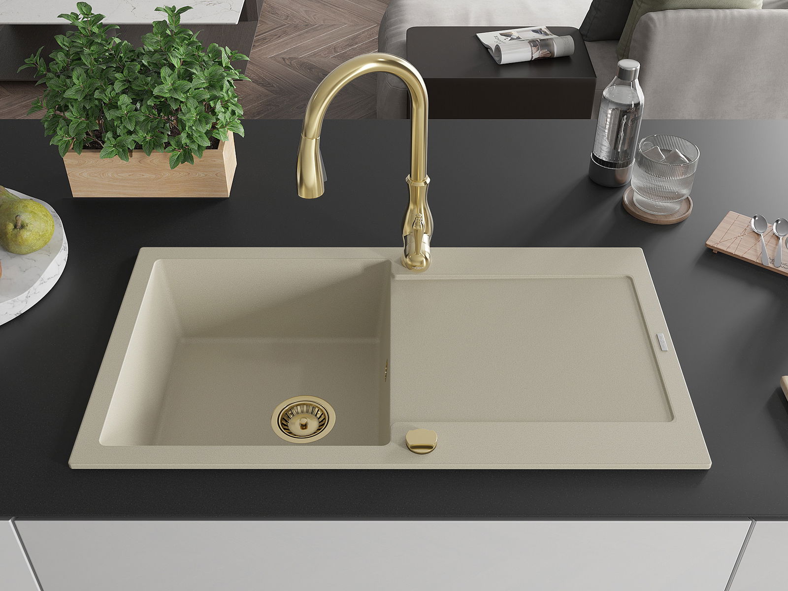 Mexen Leo гранитна кухненска мивка с 1 камера с отцедник и кухненски смесител Savita, бежов - 6501-69-672601-50