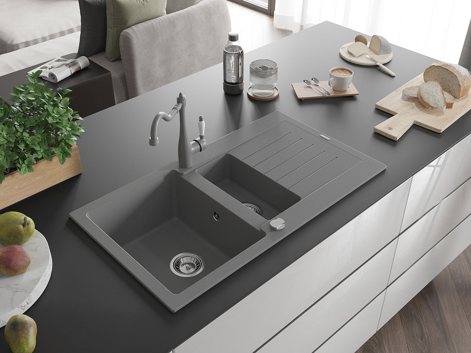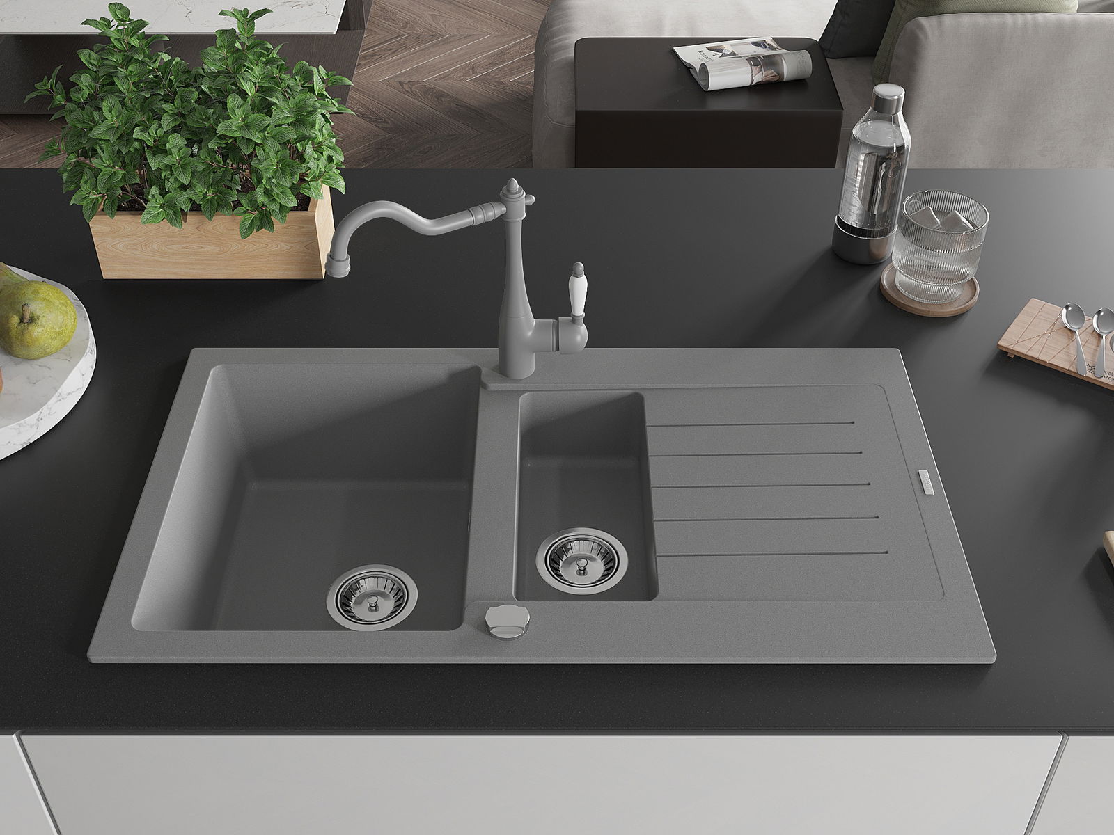 Мивката е направена от висококачествен гранит. Това е елегантно и най -вече практично допълнение към всяка кухня, независимо от нейния стил. Висококачествената и гранитна издръжливост осигуряват много години употреба.