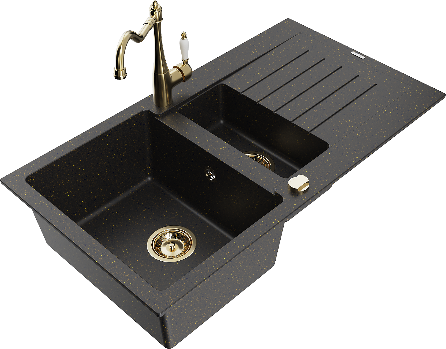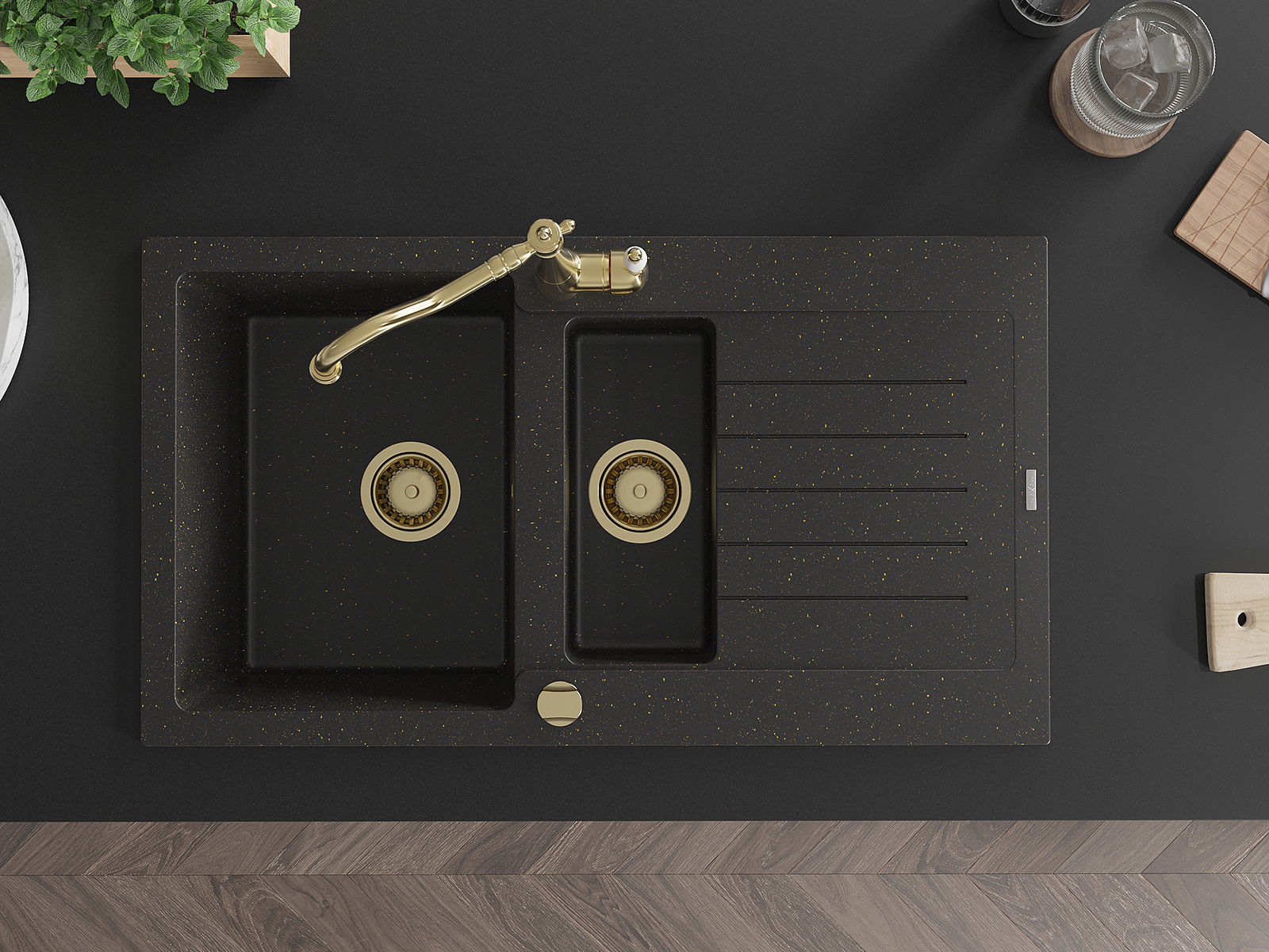 Mexen Matias гранитна мивка с 1,5 отделения със сушилник и кухненски смесител Carla, черен/златен металик - 6502-75-670700-50