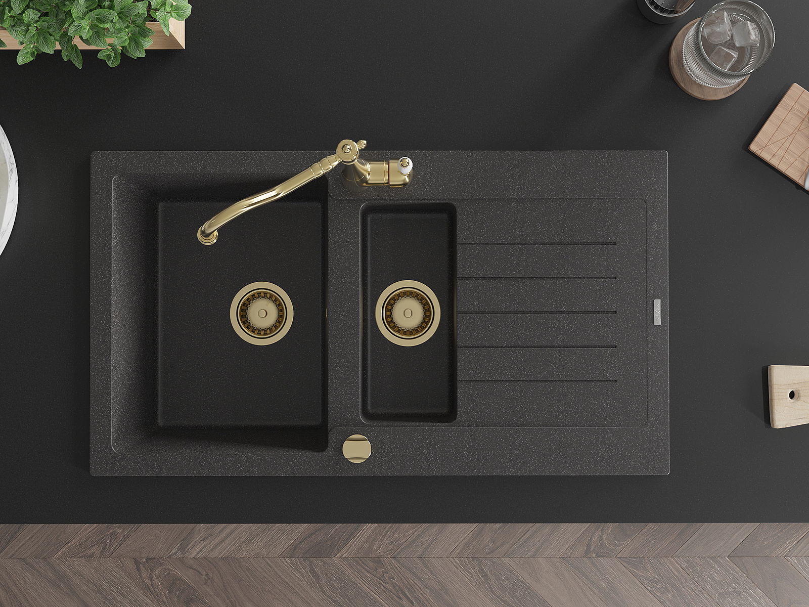 Mexen Matias гранитна мивка 1,5-камерна с отцеждащо отделение и кухненски смесител Carla, черен на точки - 6502-76-670700-50