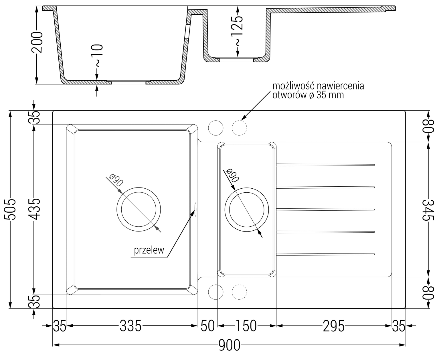 Мивката разполага с 2 предварително фрезовани отвора с диаметър 35 мм, които могат да бъдат собственоръчно пробити. Те могат да се използват, наред с другото, за монтаж на дозатор за течност, който ще елиминира присъствието на пластмасови бутилки в кухнята и ще придаде елегантен завършек.