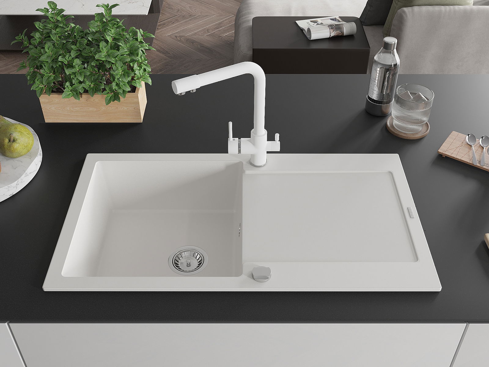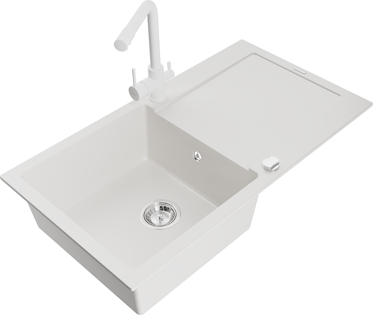 Mexen Leo гранитна кухненска мивка с 1 корито и отцедник и кухненски смесител Duero, бял - 6501-20-671600-20