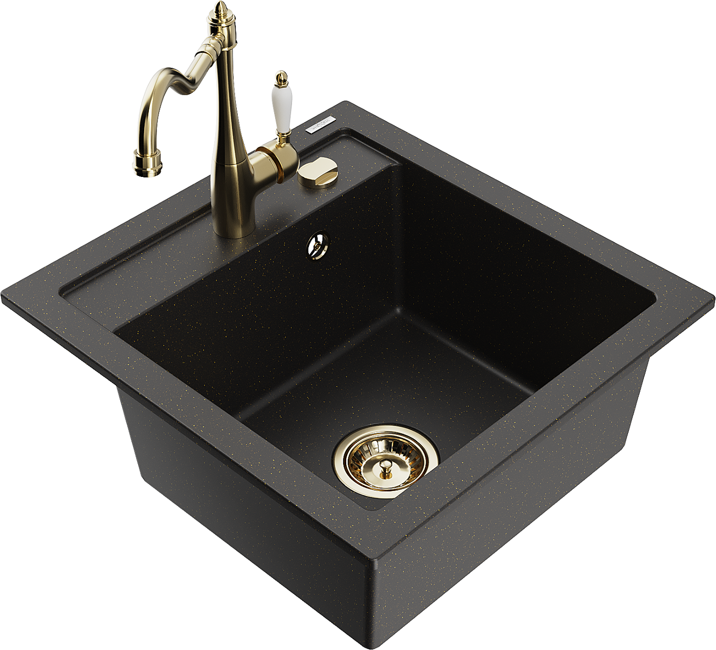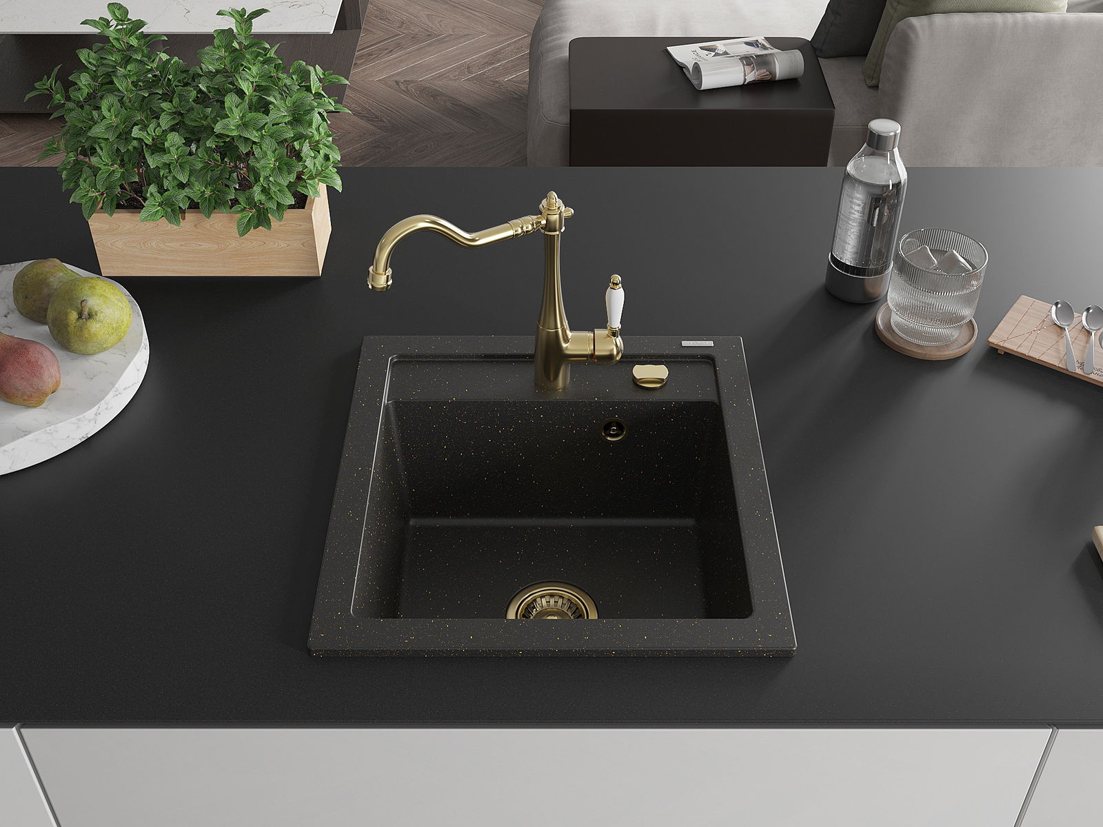 Mexen Vito гранитна мивка с 1 гнездо с кухненски смесител Carla, черно/златист металик - 6503-75-670700-50
