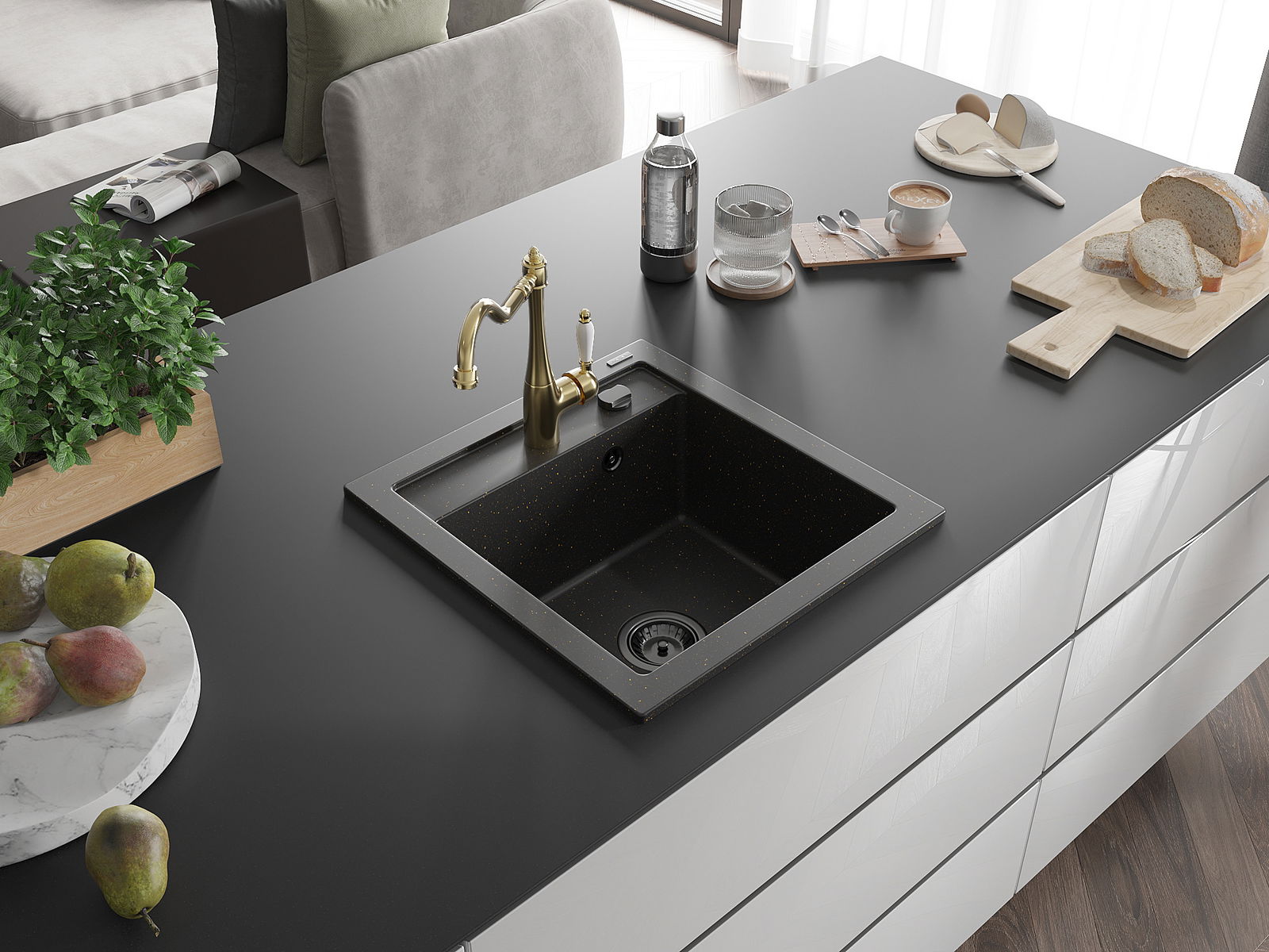 Мивката е направена от висококачествен гранит. Това е елегантно и най -вече практично допълнение към всяка кухня, независимо от нейния стил. Висококачествената и гранитна издръжливост осигуряват много години употреба.