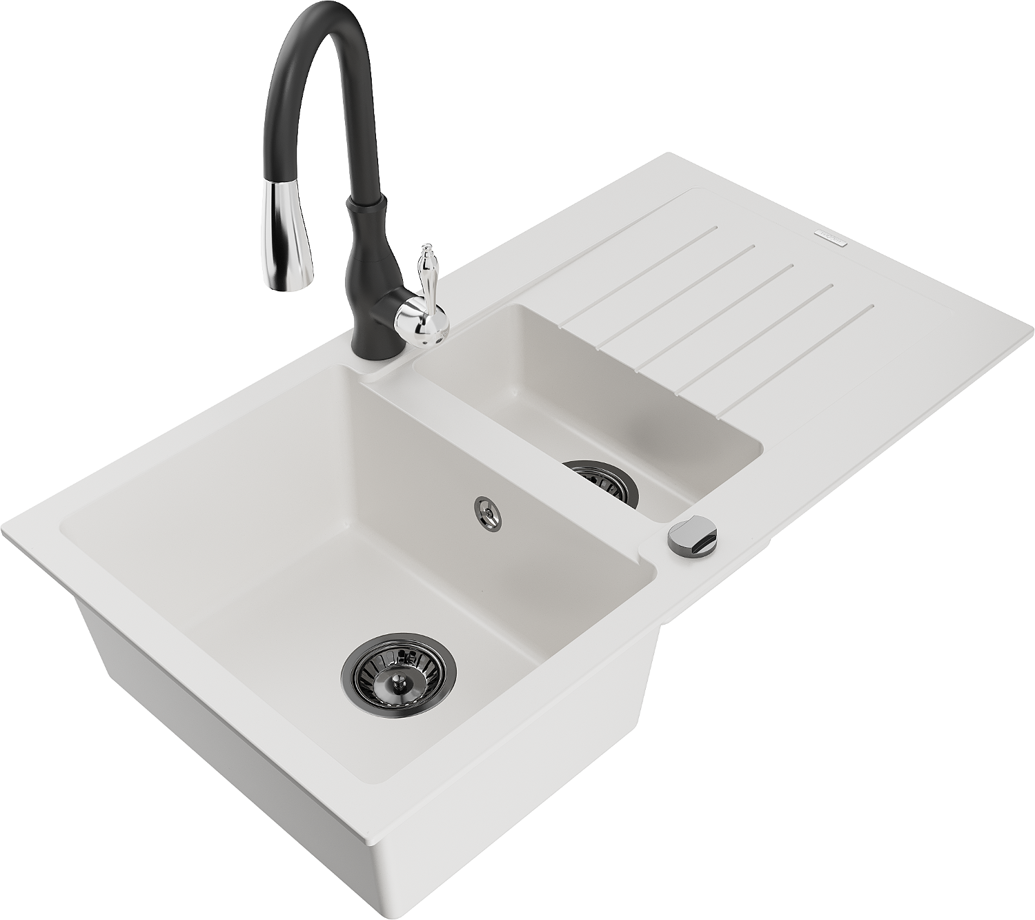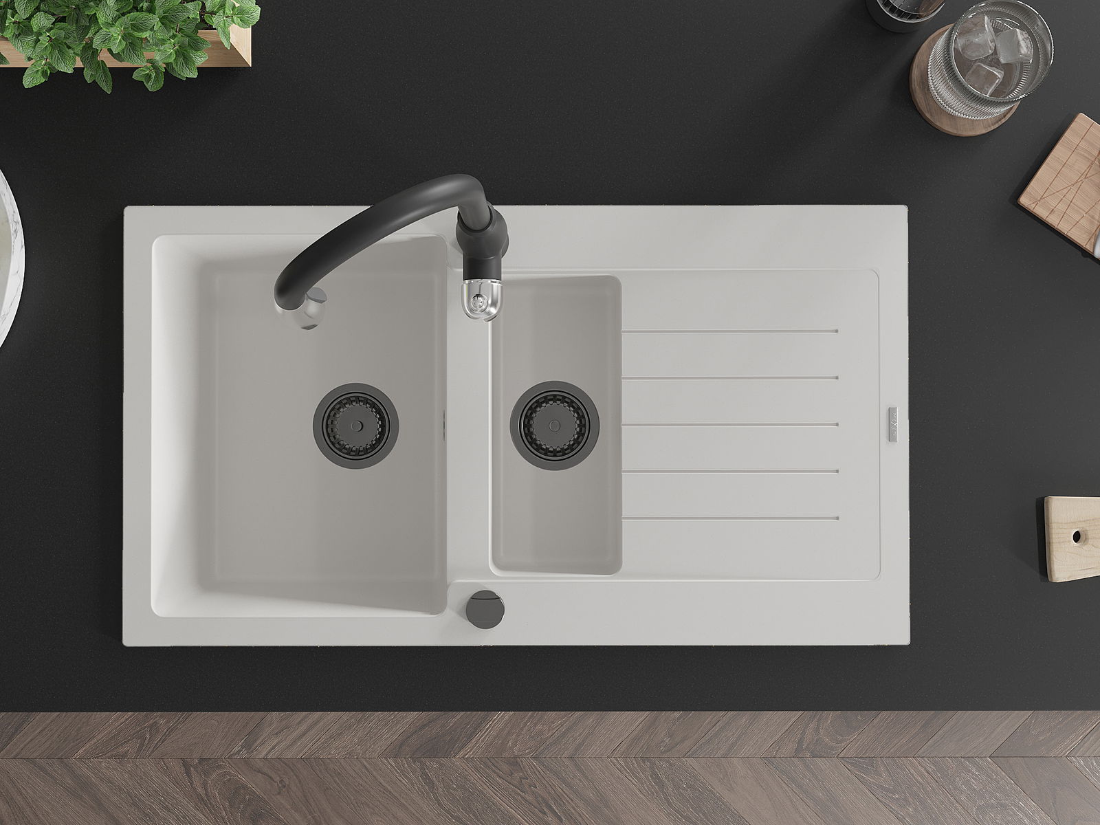 Mexen Matias гранитна мивка с 1,5 камери с отцедник и кухненски смесител Savita, бял - 6502-20-672601-70