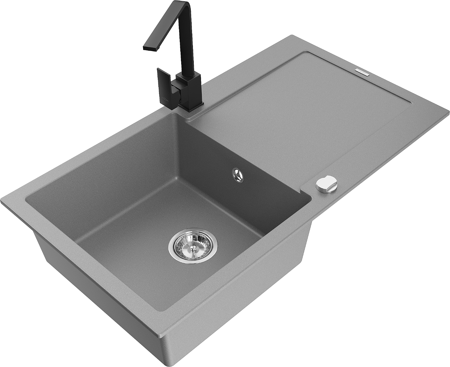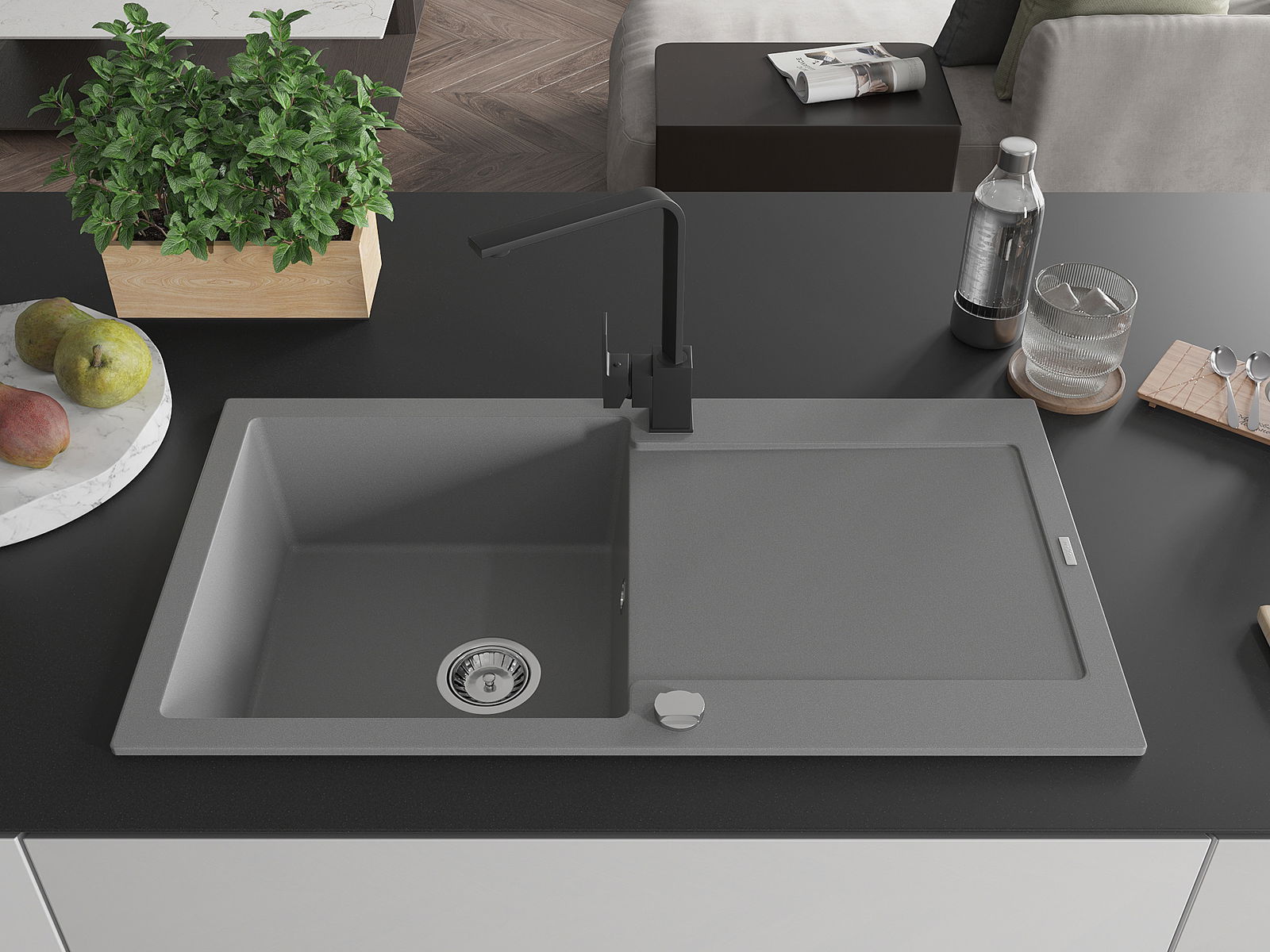 Mexen Leo гранитна кухненска мивка с 1 корито и сушилник и кухненски смесител Rita, сив - 6501-71-670300-70