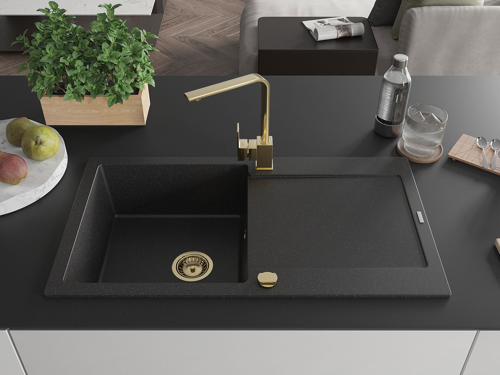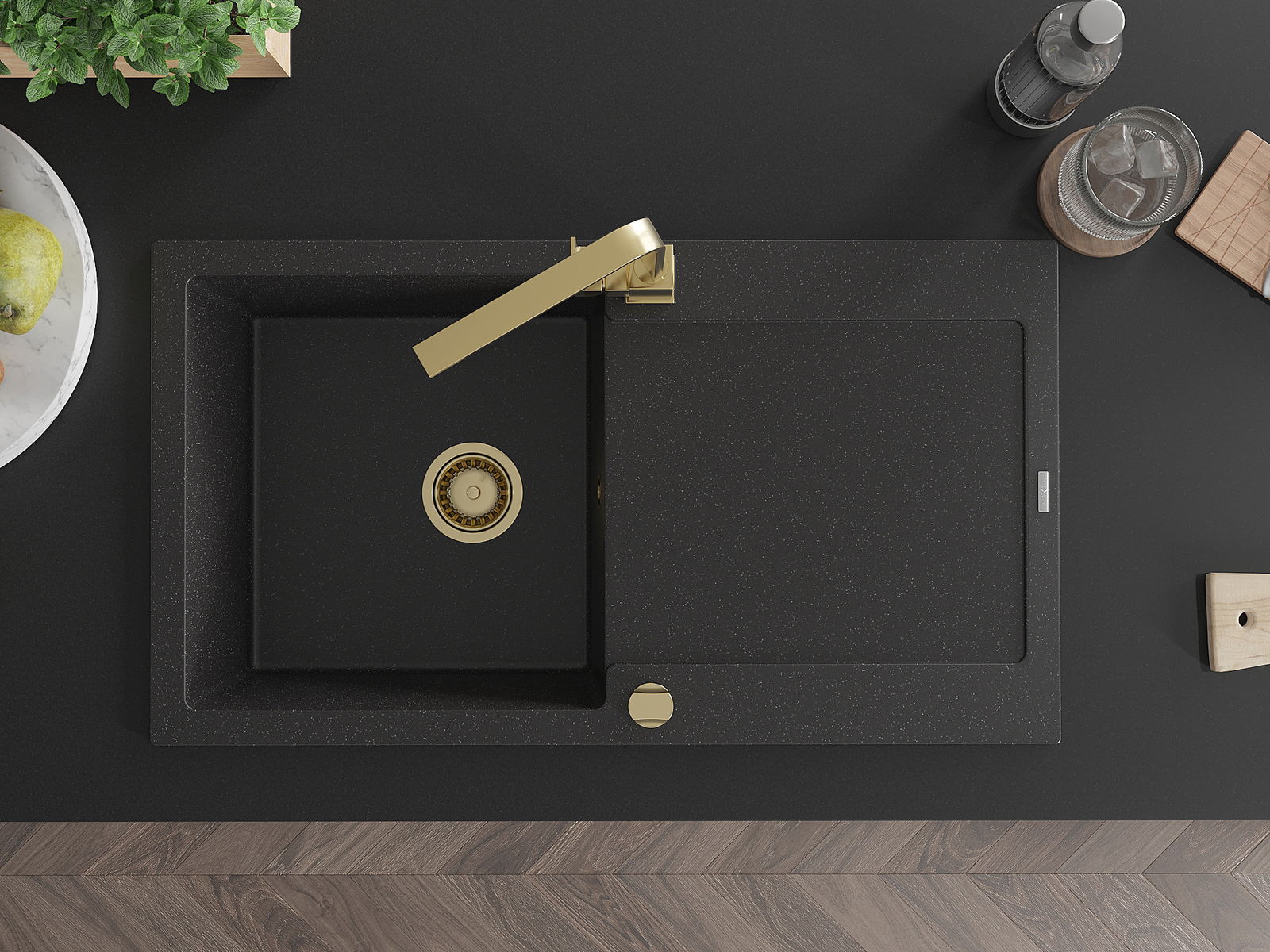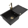 Mexen Leo гранитна кухненска мивка с 1 корито, отцедник и Rita смесител, черен/сребрист металик - 6501-73-670300-50