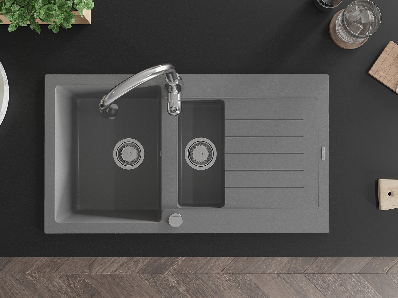 Мивка от гранит Mexen Matias 1,5-камерна с отцедник и кухненски смесител Savita, сива - 6502-71-672601-00