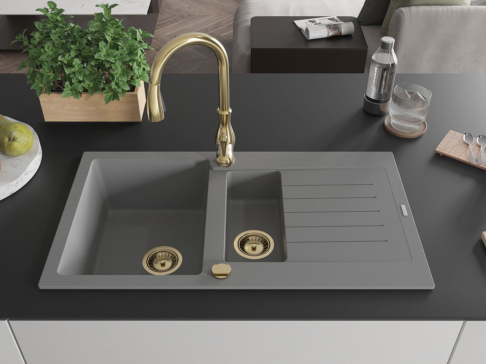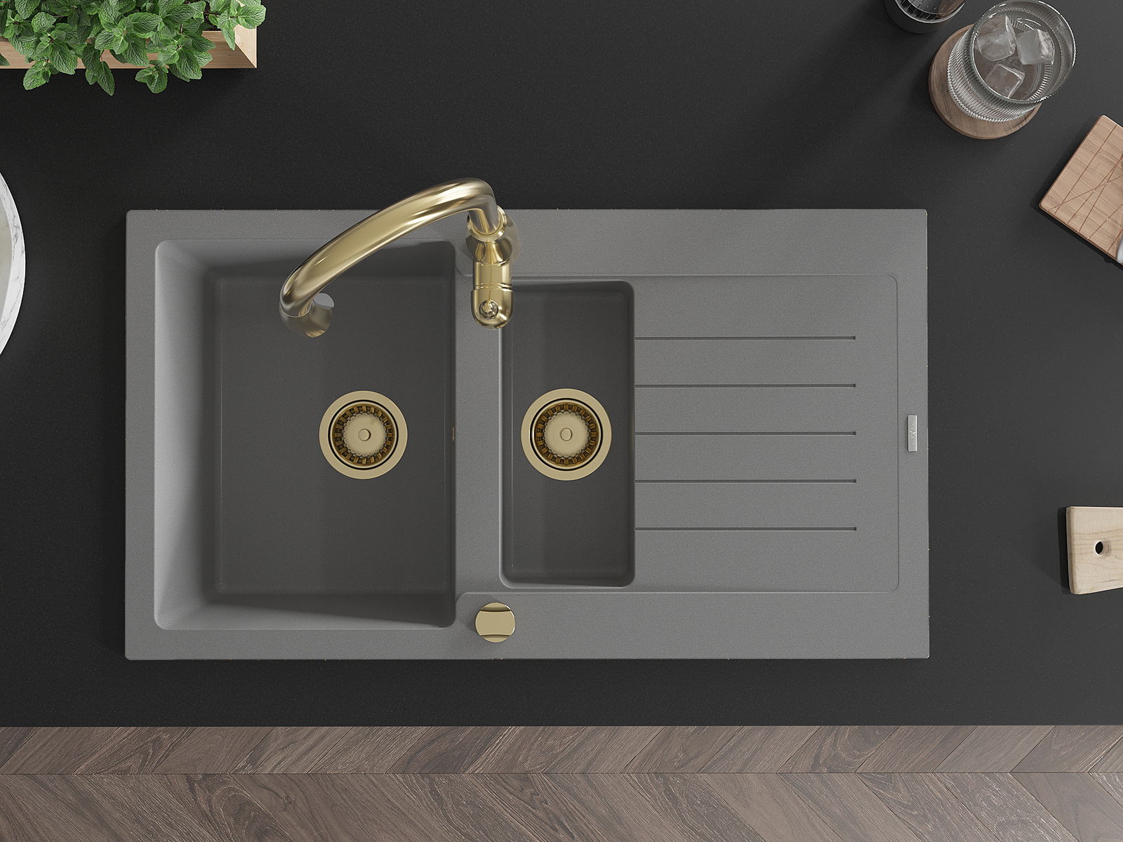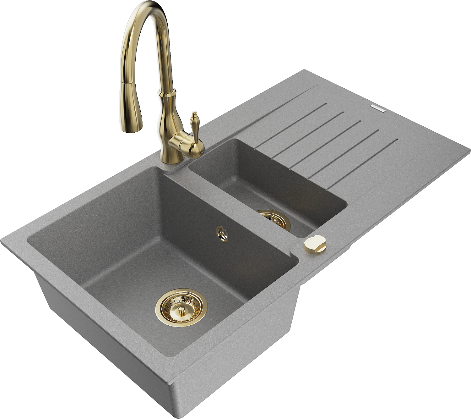 Mexen Matias гранитна мивка с 1,5 корита с отцеждаща повърхност и кухненски смесител Savita, сив - 6502-71-672601-50