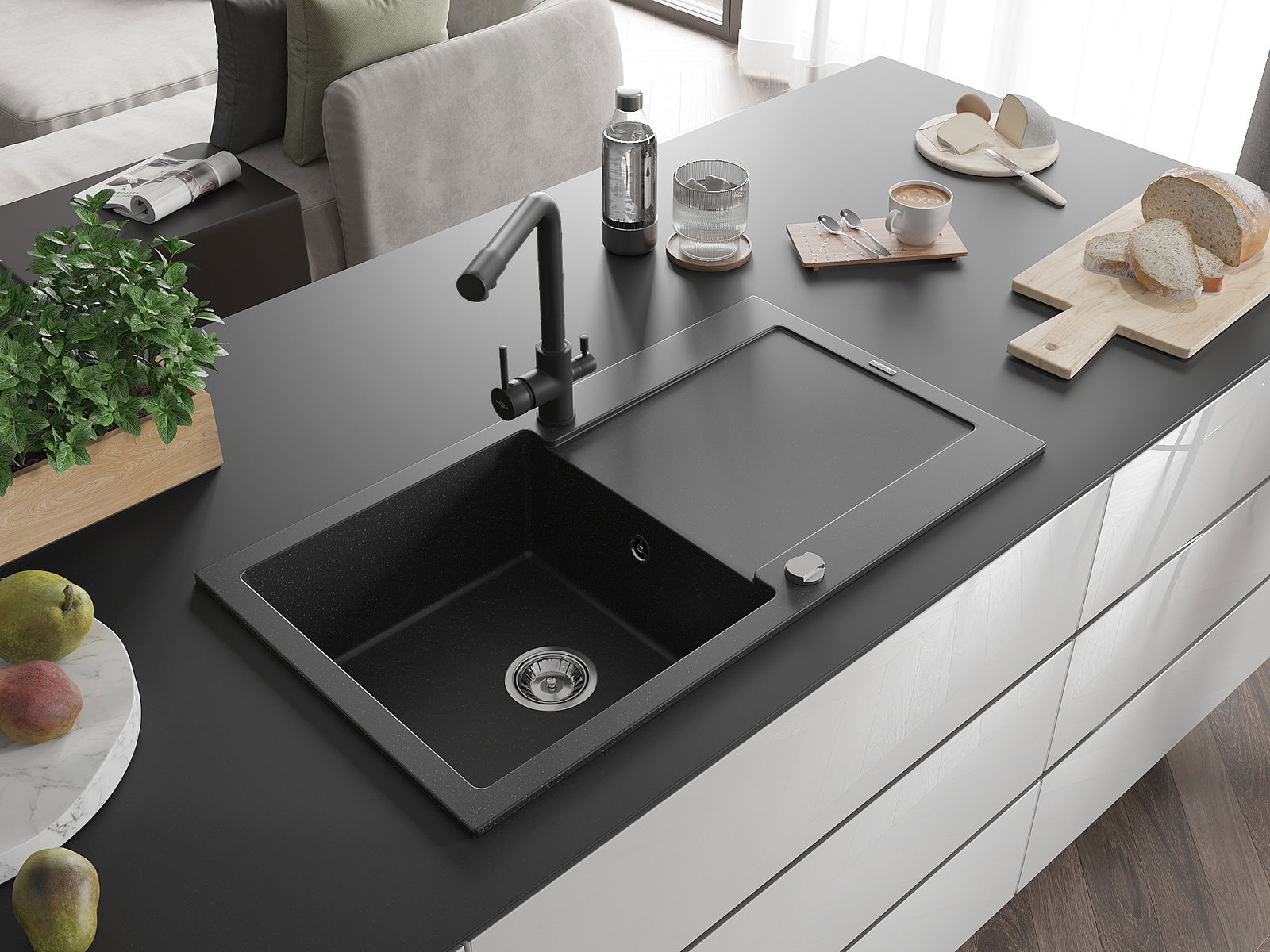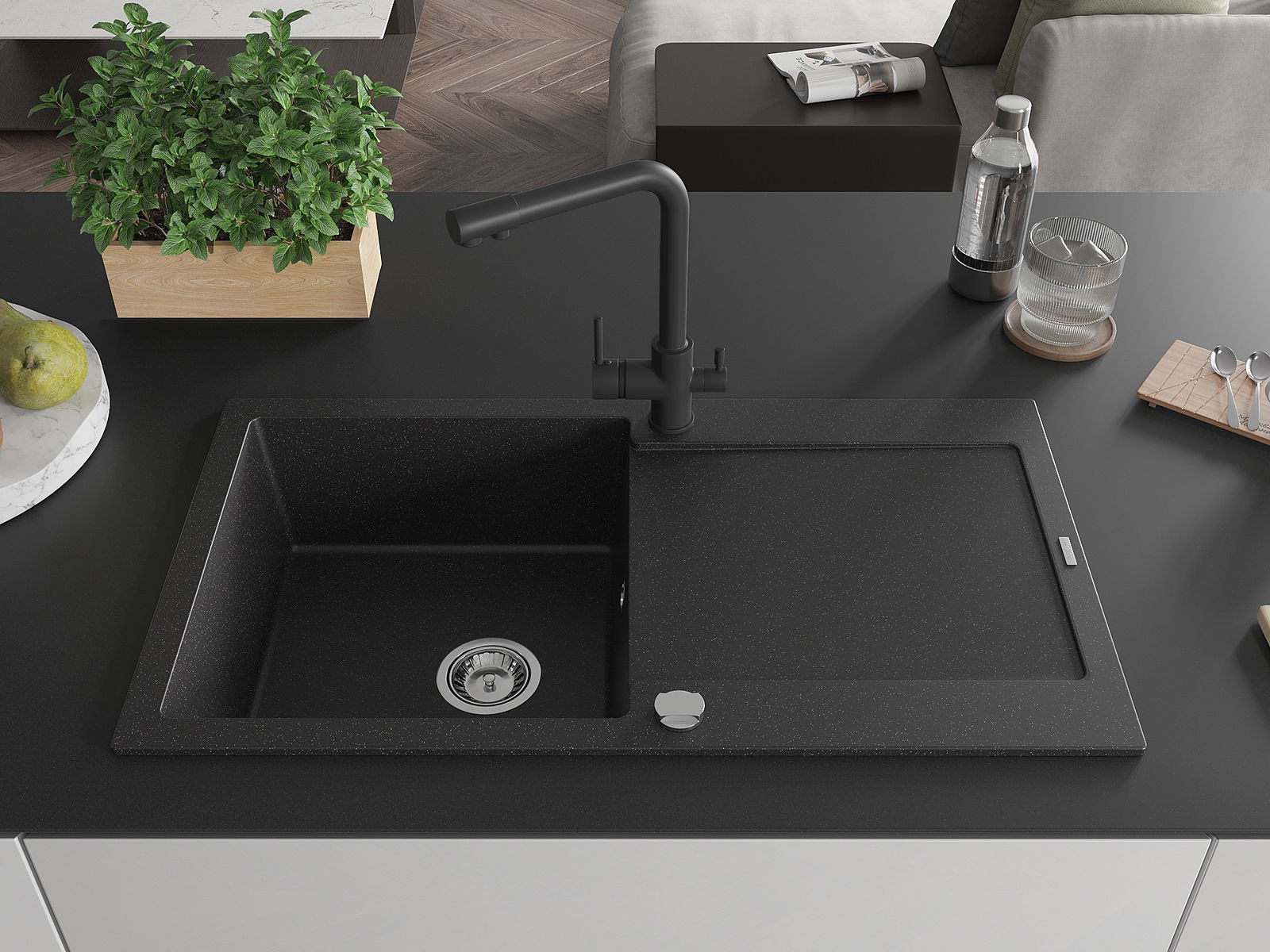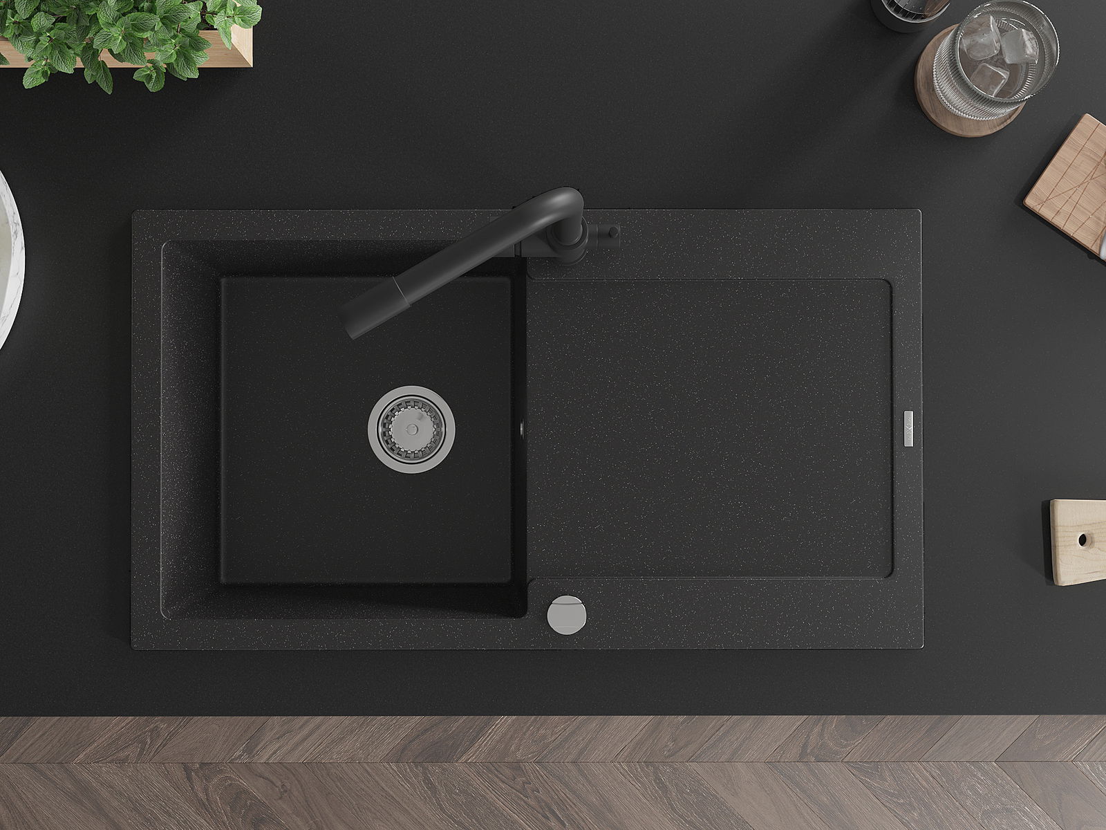 Мивката е направена от висококачествен гранит. Това е елегантно и най -вече практично допълнение към всяка кухня, независимо от нейния стил. Висококачествената и гранитна издръжливост осигуряват много години употреба.