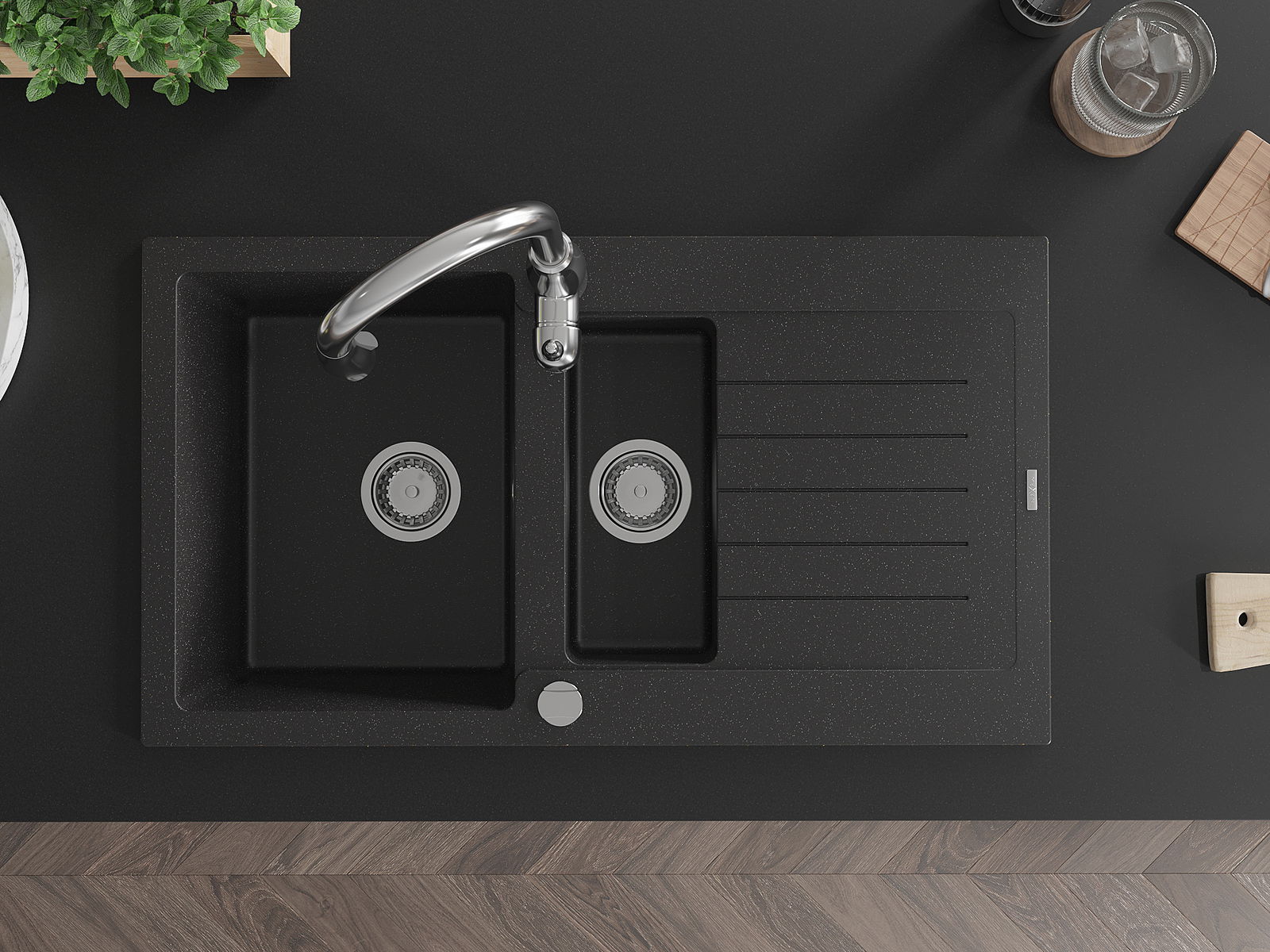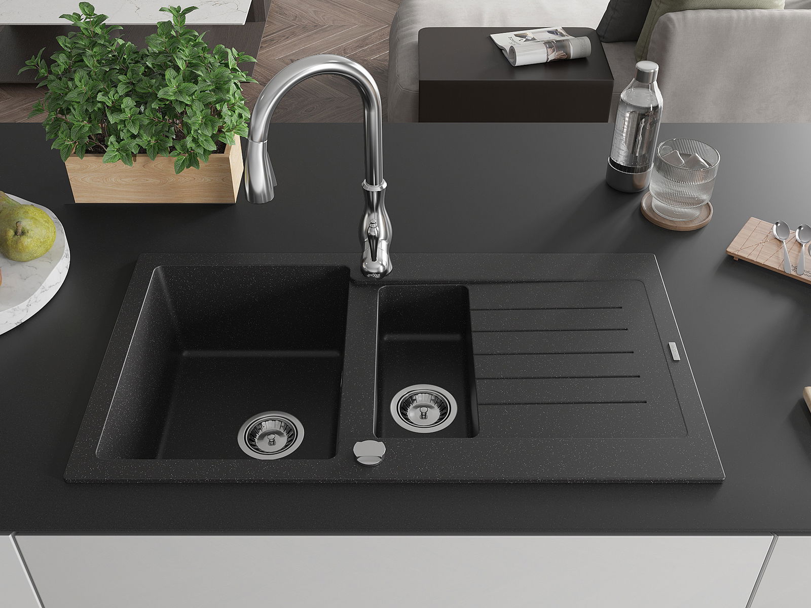 Мивката е направена от висококачествен гранит. Това е елегантно и най -вече практично допълнение към всяка кухня, независимо от нейния стил. Висококачествената и гранитна издръжливост осигуряват много години употреба.