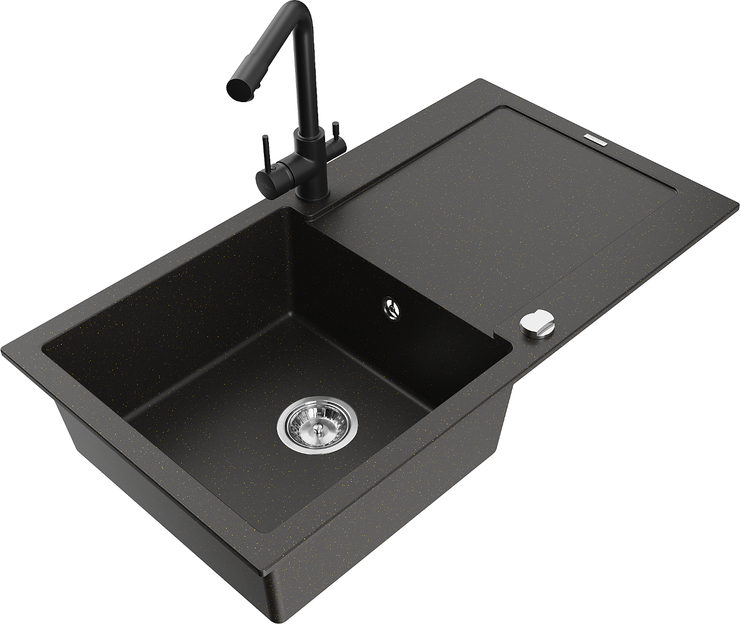 Mexen Leo гранитна мивка с 1 отделение и отцедник и кухненски смесител Duero, черен/златен металик - 6501-75-671600-70