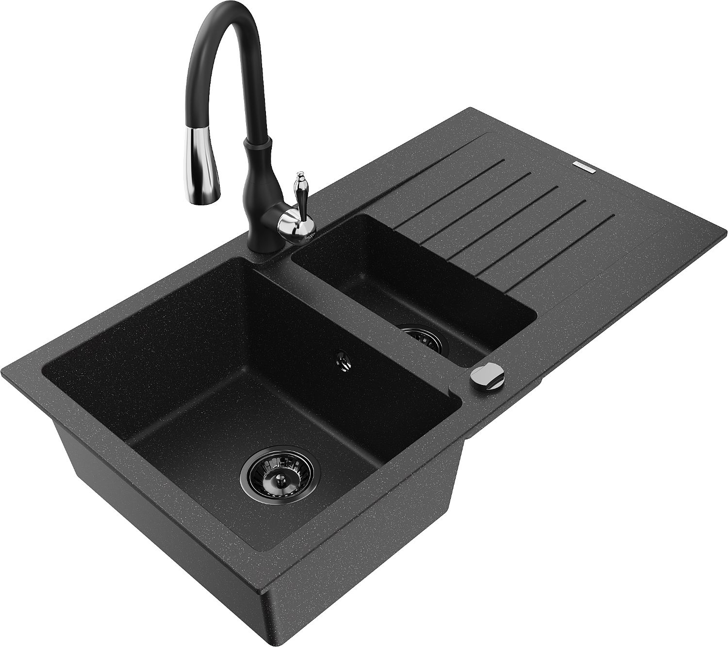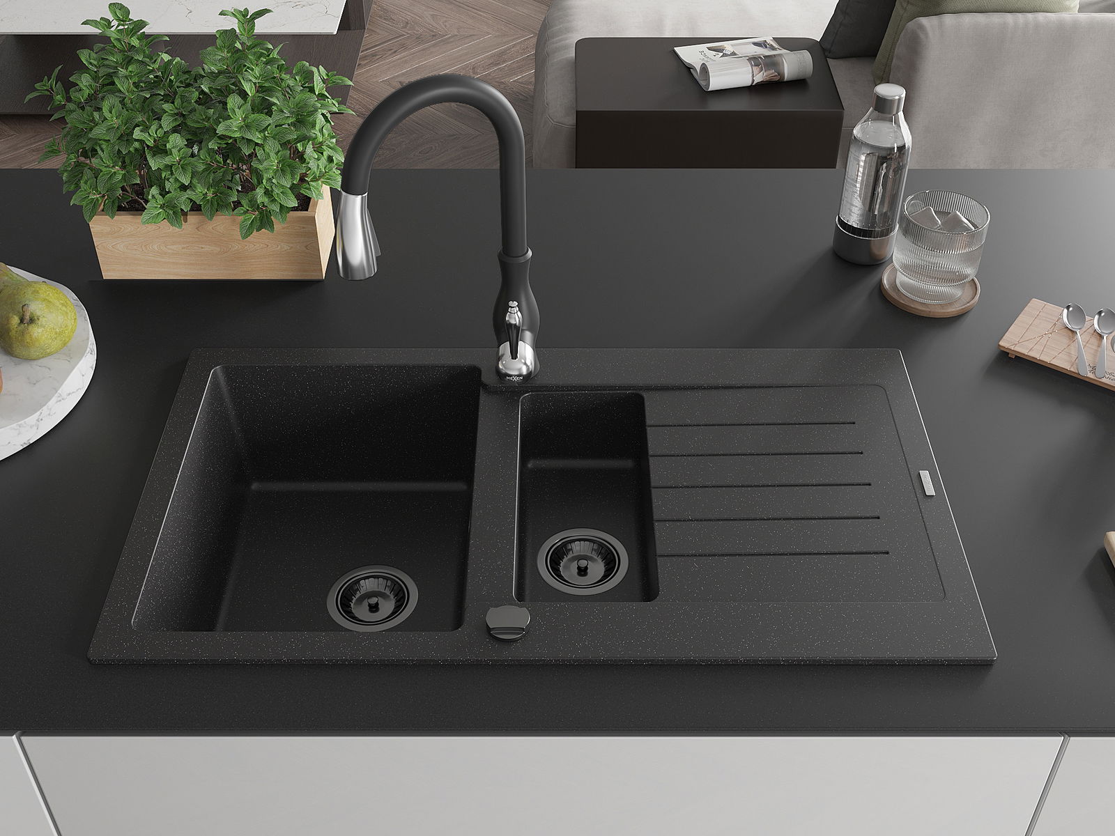 Granitна мивка Mexen Matias с 1,5 камери с отцедник и кухненски смесител Savita, черен/сребърен - 6502-73-672601-70-B