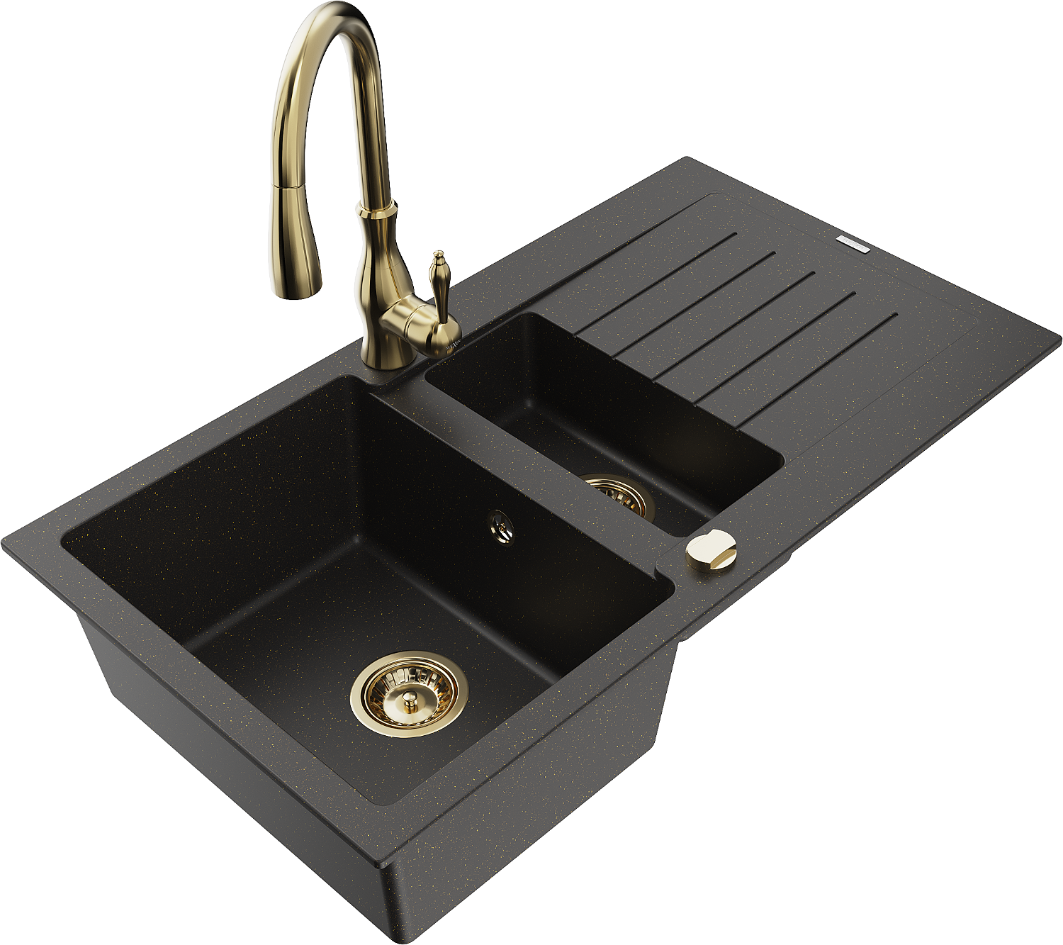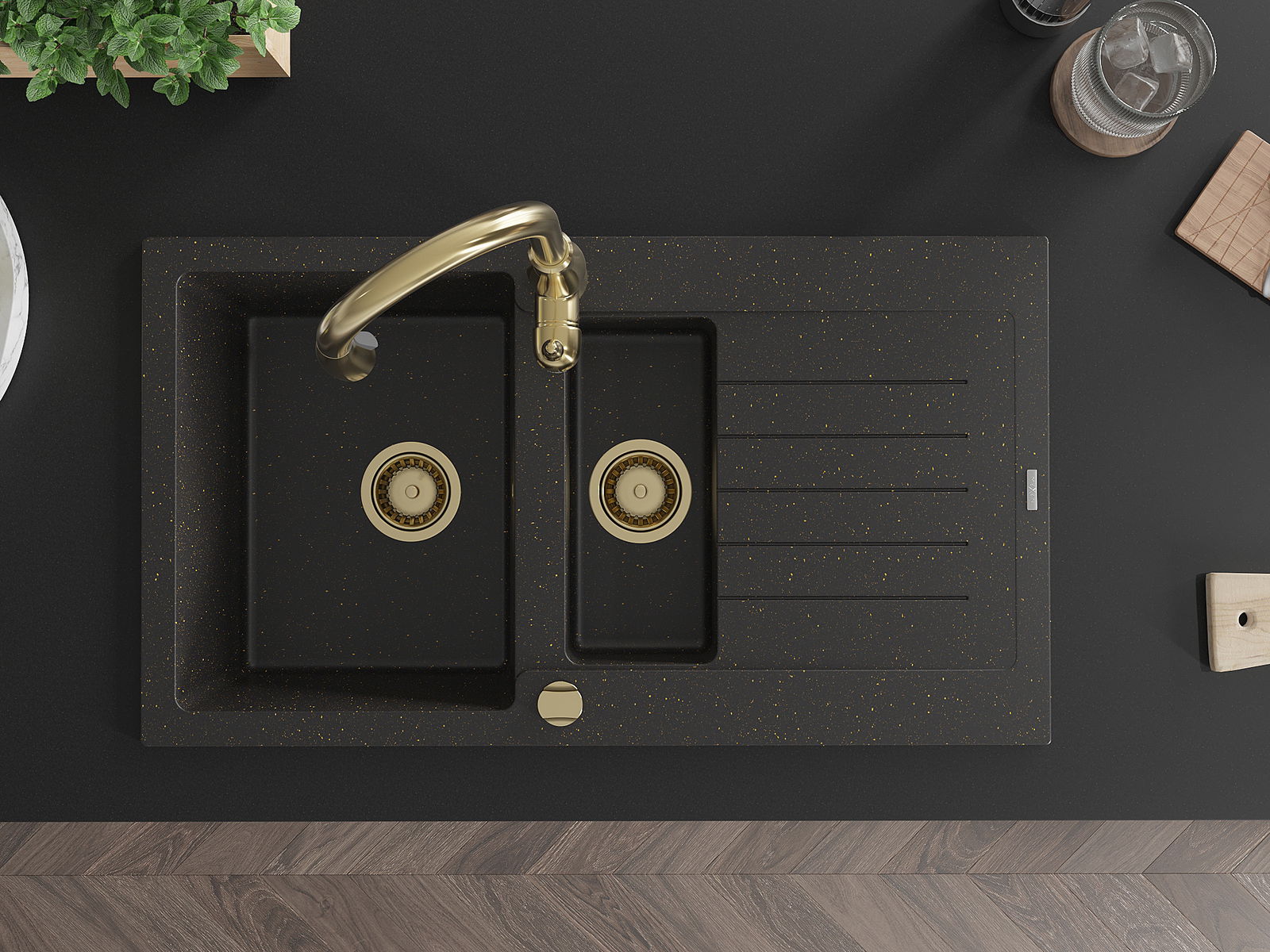 Mexen Matias гранитна мивка с 1,5 камери с отцедник и кухненски смесител Savita, черно/златно - 6502-75-672601-50