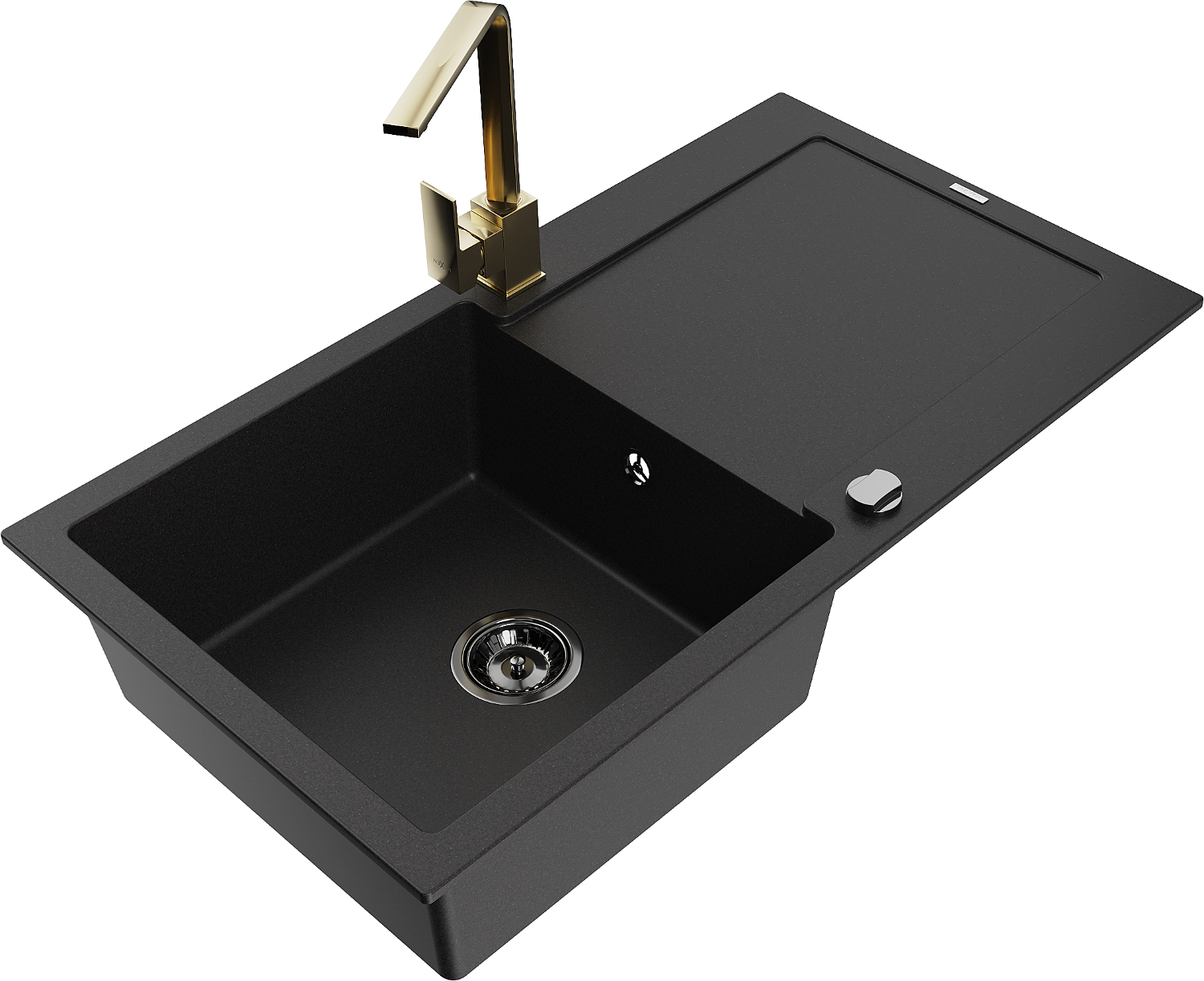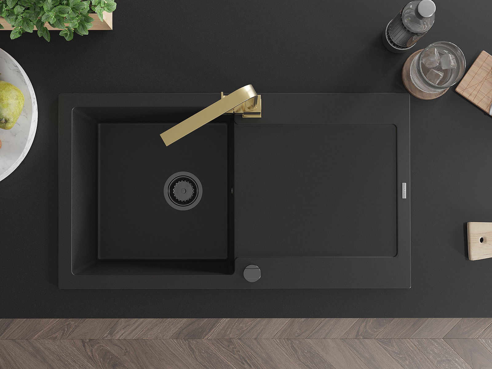 Mexen Leo кухненска мивка от гранит, 1-камерна с отцедник и кухненски смесител Rita, черен - 6501-77-670300-50-B