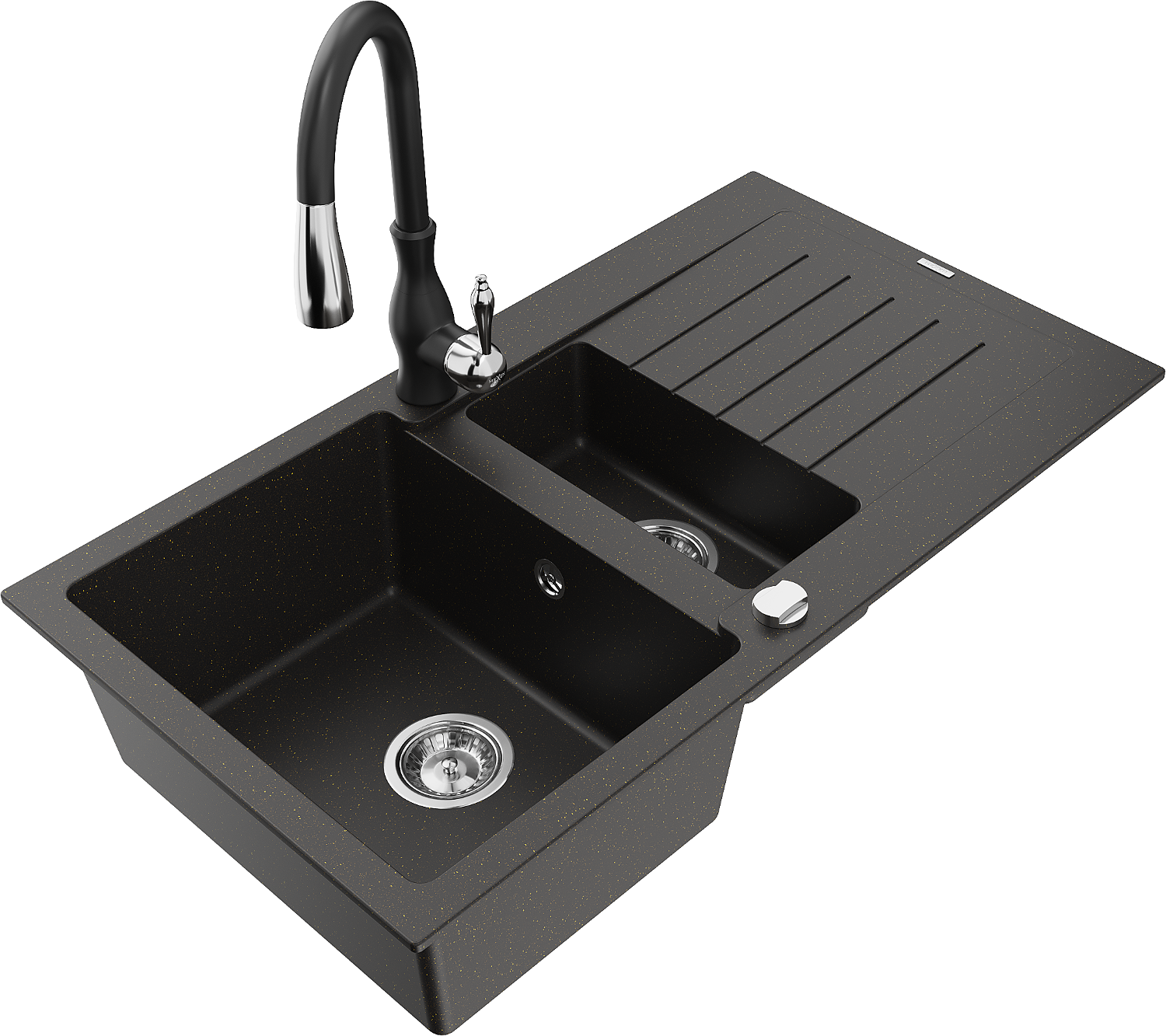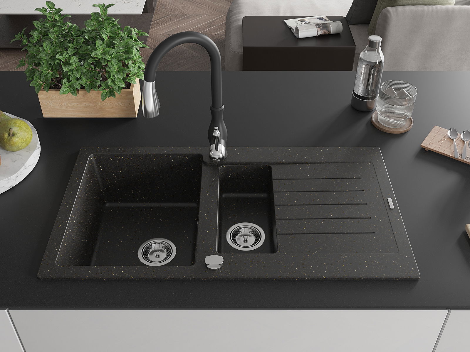 Mexen Matias гранитна мивка 1,5-камерна с отцедник и кухненски кран Savita, черно/златно - 6502-75-672601-70