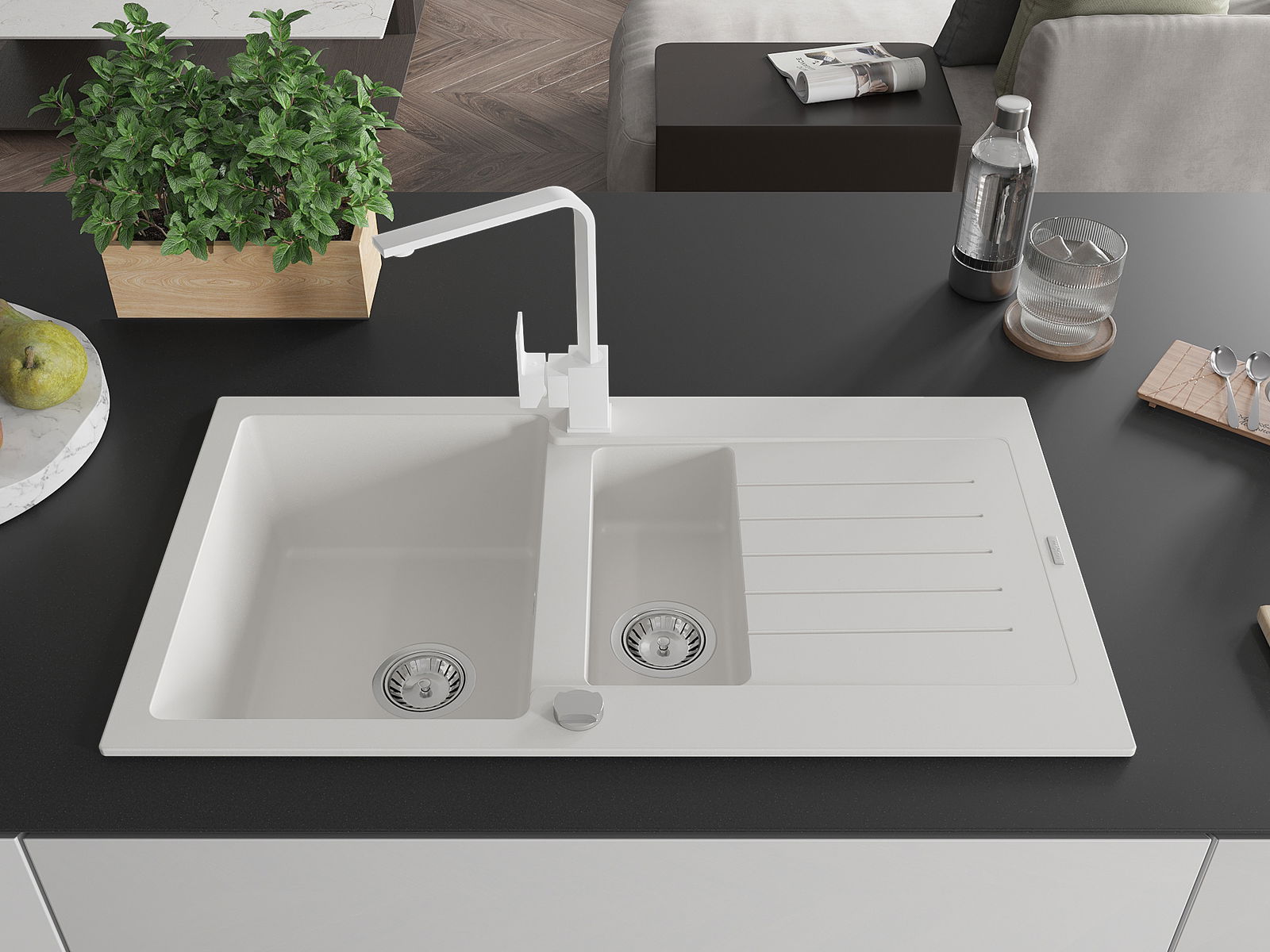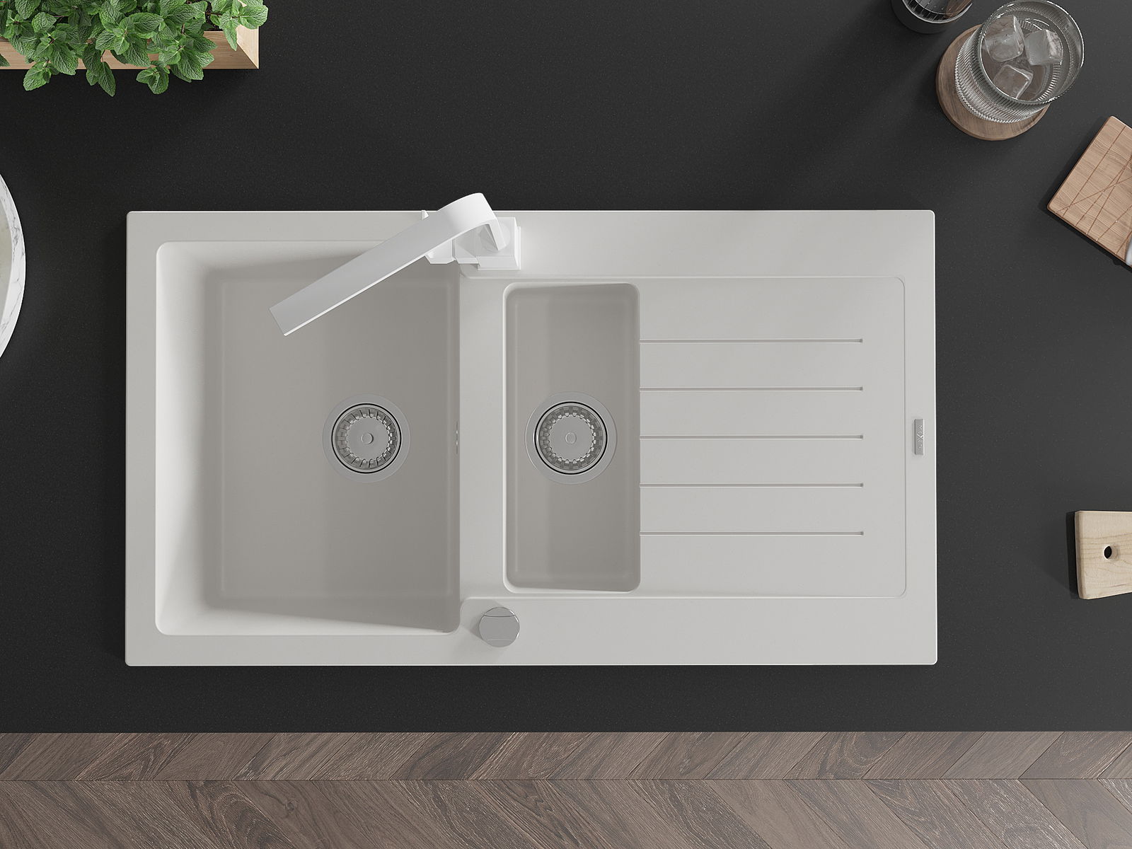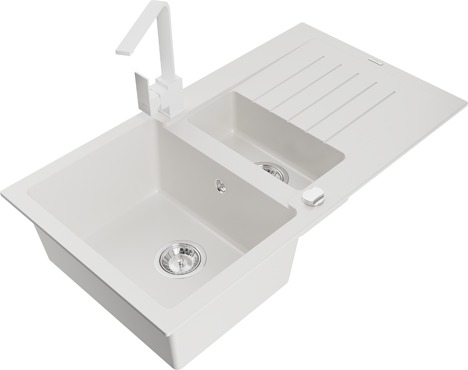 Mexen Matias гранитна мивка с 1,5 отделения с отцедник и кухненски кран Rita, бял - 6502-20-670300-20