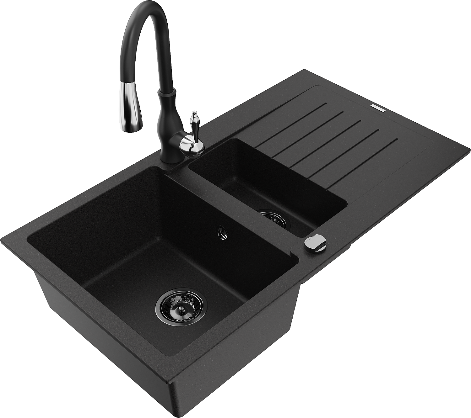 Mexen Matias гранитна мивка 1,5-камерна с отцедник и кухненски смесител Savita, черен - 6502-77-672601-70-B