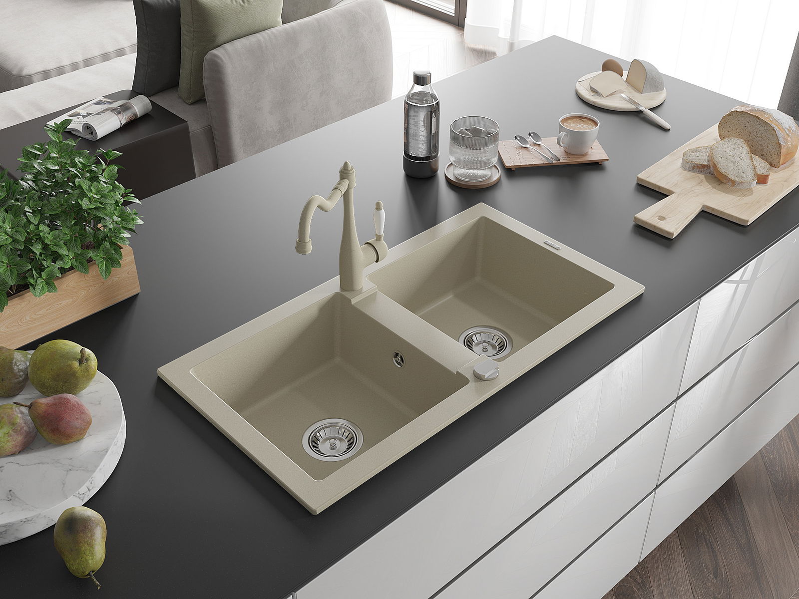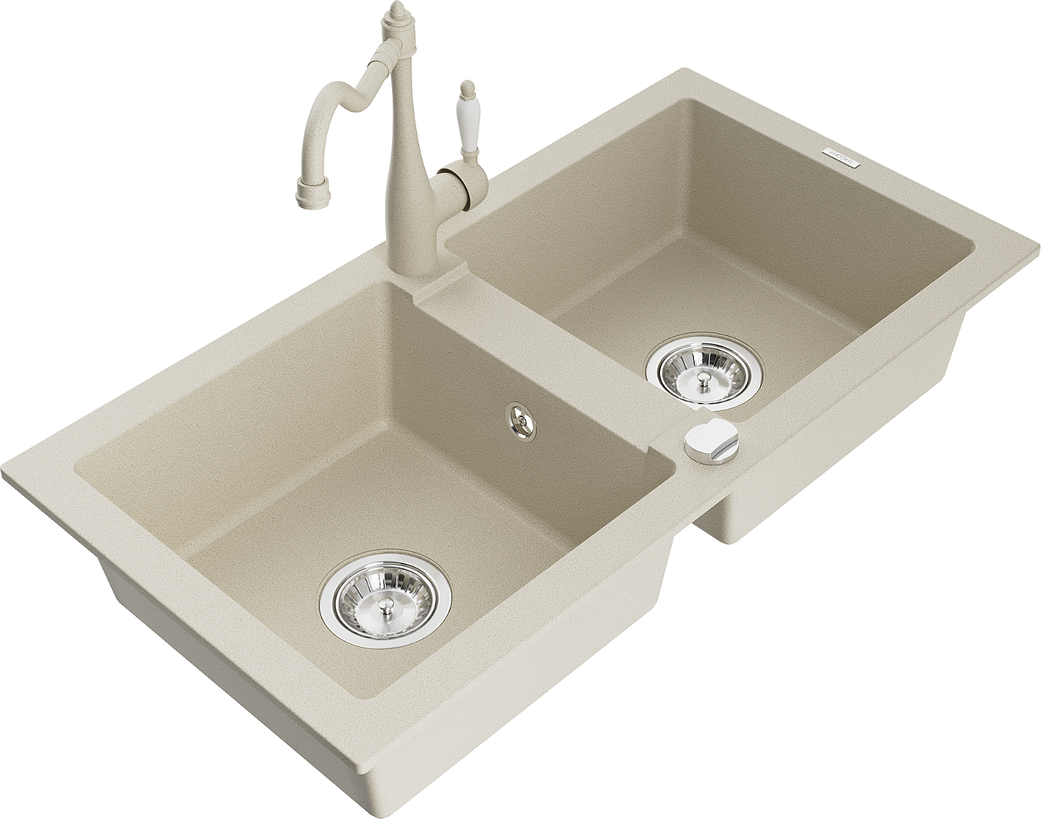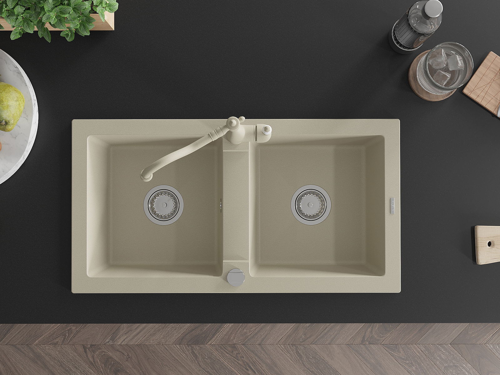 Mexen Mario гранитна кухненска мивка с 2 камери и кухненски смесител Carla, бежов - 6504-69-670700-69